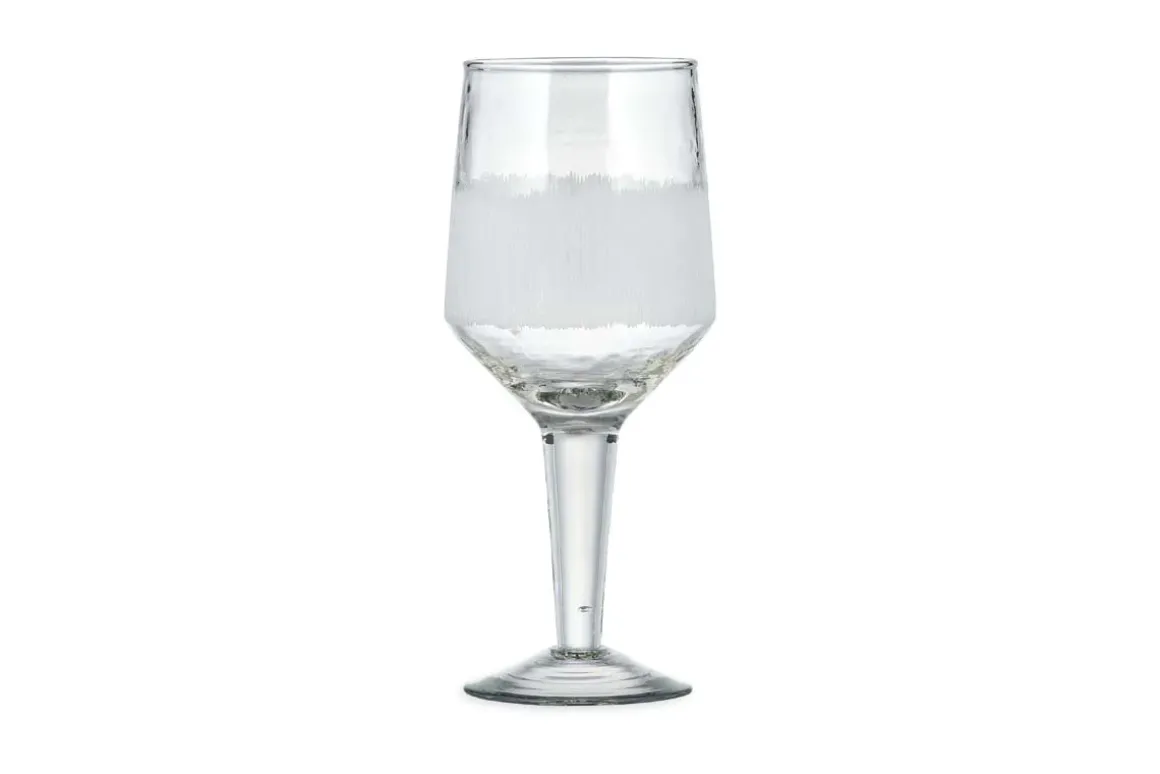 The large Anara wine glass is generously proportioned and stylishly adorned with a etched frosting design, perfect for relaxed lunches and more elaborate evening entertaining. Crafted from recycled glass, the etching is carefully completed using traditional techniques.