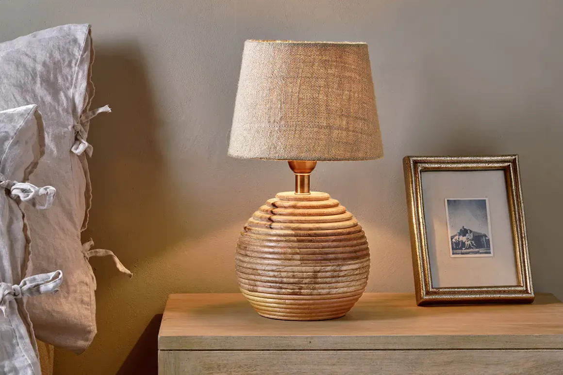 Made from sustainable mango wood and hand crafted in India, the relaxed aesthetic of the Drisana lamp makes it a perfect addition to a bedroom setting. The beautiful hand carved grooves and the warm tones of the wood are an effortless way to bring natural texture to an interior scheme. This lamp is made from multiple offcuts of mango wood, creating a beautiful pattern with subtle variations from the different grains, while reducing waste from offcuts at the same time.