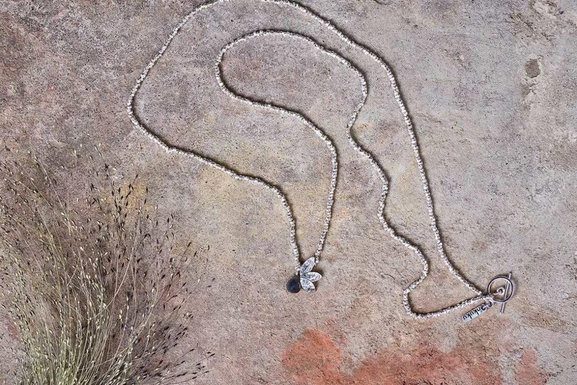 Our silver plated Elina labradorite Necklace has a delicately shaped chain and is finished with a hand-cut labradorite stone and hammered silver leaf design to create an elegant pendant. Labradorite is an iridescent stone that comes in a range of tones; – here we have chosen ones with a delicate grey hue for versatility when pairing with other pieces and because it captures the light beautifully, exuding an effortless grace and simplicity. Labradorite is associated with the throat and third eye chakra and is said to be connected to communication, wisdom and intuition. We are particularly excited to share our silver jewellery collection as it is the first we have launched in many years.