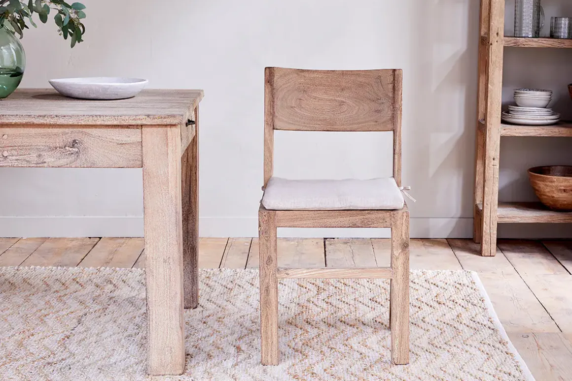Our new Fioni collection is admired not only for its warmth and effortless simplicity, but for the fact that it welcomes in a new material to the nkuku range. The Fioni design uses reclaimed wooden ceiling beams from India where they are repurposed and handcrafted to create unique and timeless pieces that offer the perfect foundation for an understated dining area. Sanded and lightly finished with a white wash, the mixed woods are harmonised in appearance yet still allow for subtle variations in tone and grain to shine through, lending a laidback farmhouse aesthetic to the overall look of this perfectly proportioned chair. A natural linen seat pad with ties finishes the look. This pairs with the Fioni dining tables.