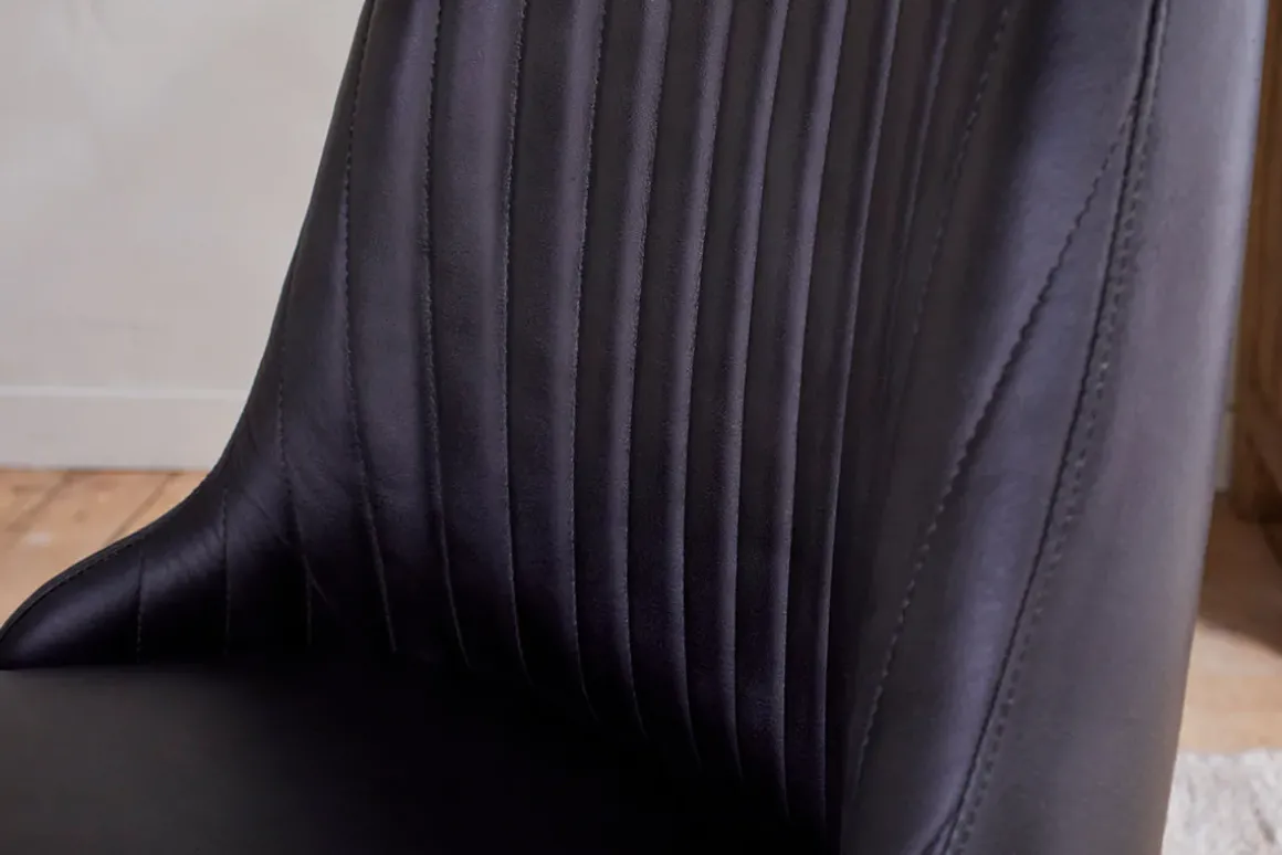 Sophisticated and stylish, the Harsha Dining Chair is beautifully upholstered in handmade buffalo leather, dyed a deep inky black, and stitched vertically along the back for a striking ribbed finish. Offering both comfort and support, the timeless design of this chair, with its elegant silhouette and simple iron frame works equally well at a dining table or at a desk.
