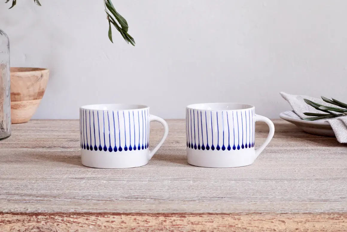 We’ve updated our best selling hand-painted Iba design with a new shape and change of clay that gives the range a light and fresh feel – perfect for revitalising your ceramics line up. Choose the larger size for a longer coffee or tea, the smaller for a short barista-style coffee. Both can be mixed and matched with the iconic Indigo Drop – creating an eclectic blend of patterns in a similar tonal hue. This is a set of two.