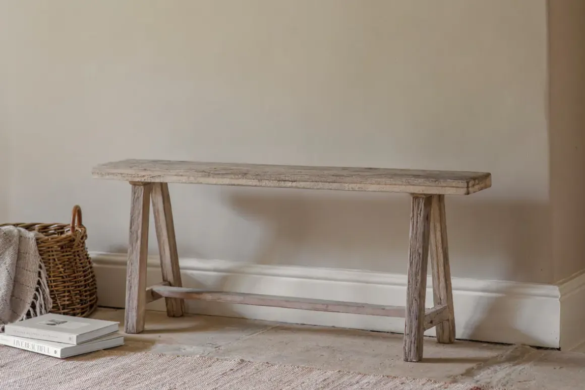 Our Ibo collection has an ingenious and creative origin story in the wooden panels from Indian trucks. The weathered tone and imperfections of the materials used in the Ibo Long Bench come through beautifully, with every piece showing unique variations in the tone of the wood, authentic rough textures, and knots and splits in the grain which only add to the rustic charm. Strong and sturdy, the long, narrow design is stylish yet simple, perfect for perching in a hallway, at the end of a bed, or even in a kitchen space or landing. The pale, natural finish creates a laidback look that fits into a relaxed decor and brings tactility and interest to a room.