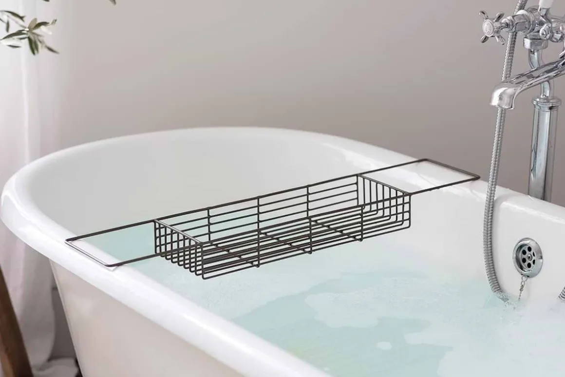 The Indore wire bath bridge provides a stylish and practical way to hold bathroom bottles and soaps. The iron wire has been expertly shaped into neat industrial looking lines and has an aged brass finish. The practical extended wire handles rest neatly on either side of a bath. Start a new ritual of unwinding after a long day and create a stylish bathroom space.