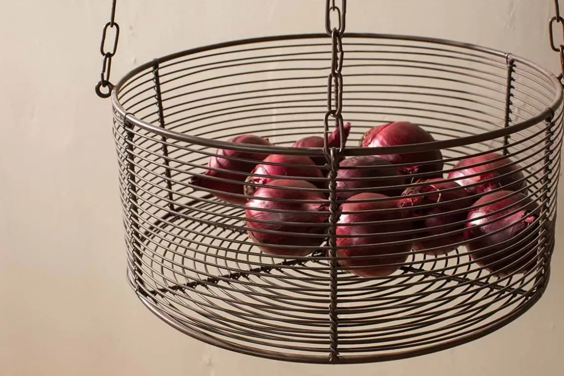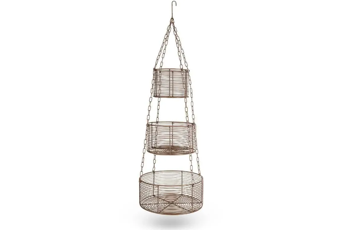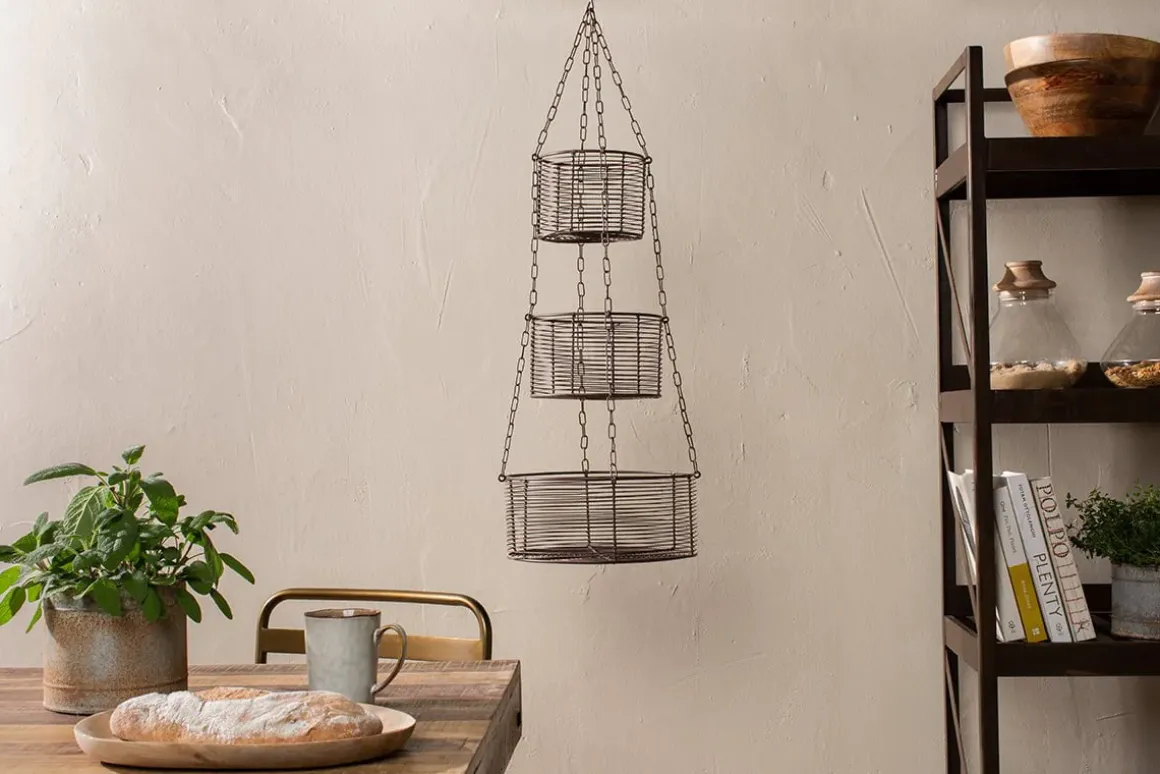 Our Inkollu hanging basket set combines style with practicality. Crafted from elegant wirework with a warm aged brass finish, its pared back and functional design brings a sophisticated touch to kitchen storage. The baskets are arranged as three tiers in differing sizes, each suitable for holding a wide variety of utensils, and the entire set is elegantly suspended from a practical hanging hook. These hanging baskets provide an easy and clutter-free way for you to access your kitchen accessories.