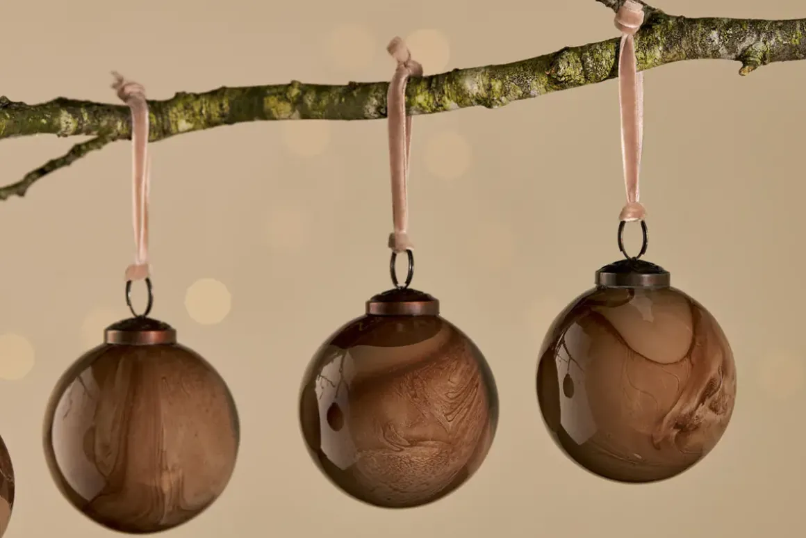 We love the pared-back recycled glass Kancha Baubles for their unique patina. Each one is individually mouth-blown which leads to variations in the glass and gives the mocha colour a beautifully mottled effect. Understated and neutral, these baubles offer a natural festive look that is simple and unadorned.