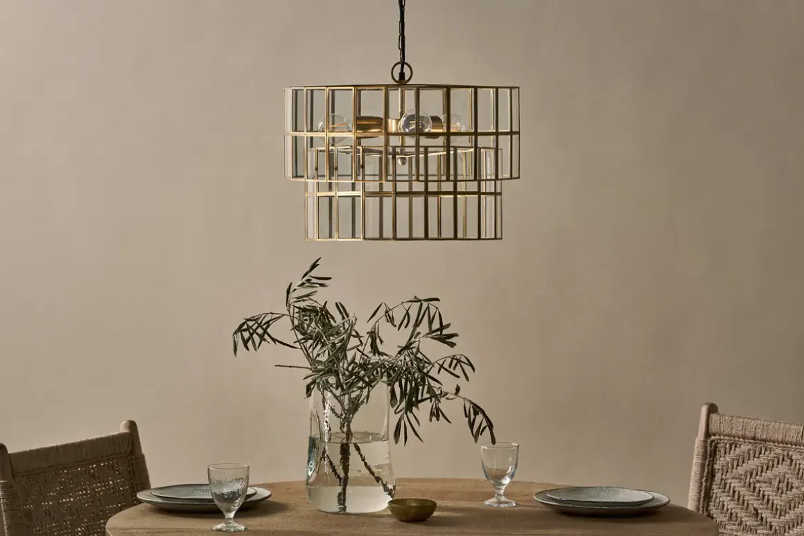 We’ve added this stunning two-tier chandelier to our Kirindi lighting range. The unique design features have been carefully chosen to enhance the overall piece. The glass panels have been set within an iron frame that has been given an antique brass finish, with a matching brass bulb holder and hanging chain. This creates a simple yet elegantly versatile design, while the size of the panes and the over-layering effect creates real impact. This Kirindi glass panelled chandelier would look sensational as a pair in a living room, or above a dining table or in a hallway for a striking statement. A Kirindi pendantis also available.