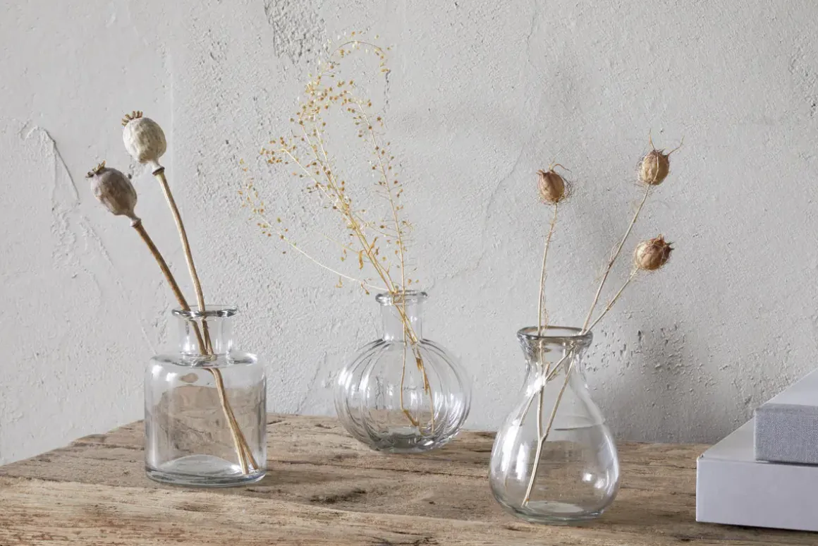 This set of three bud vases features organic shapes and subtly imperfect edges, with natural bubbles in the glass that add character and texture. Perfectly sized for fresh or dried stems, they make a charming addition to a bedside table, windowsill, dining table or mantelpiece. Beautifully boxed, they also make a thoughtful gift.