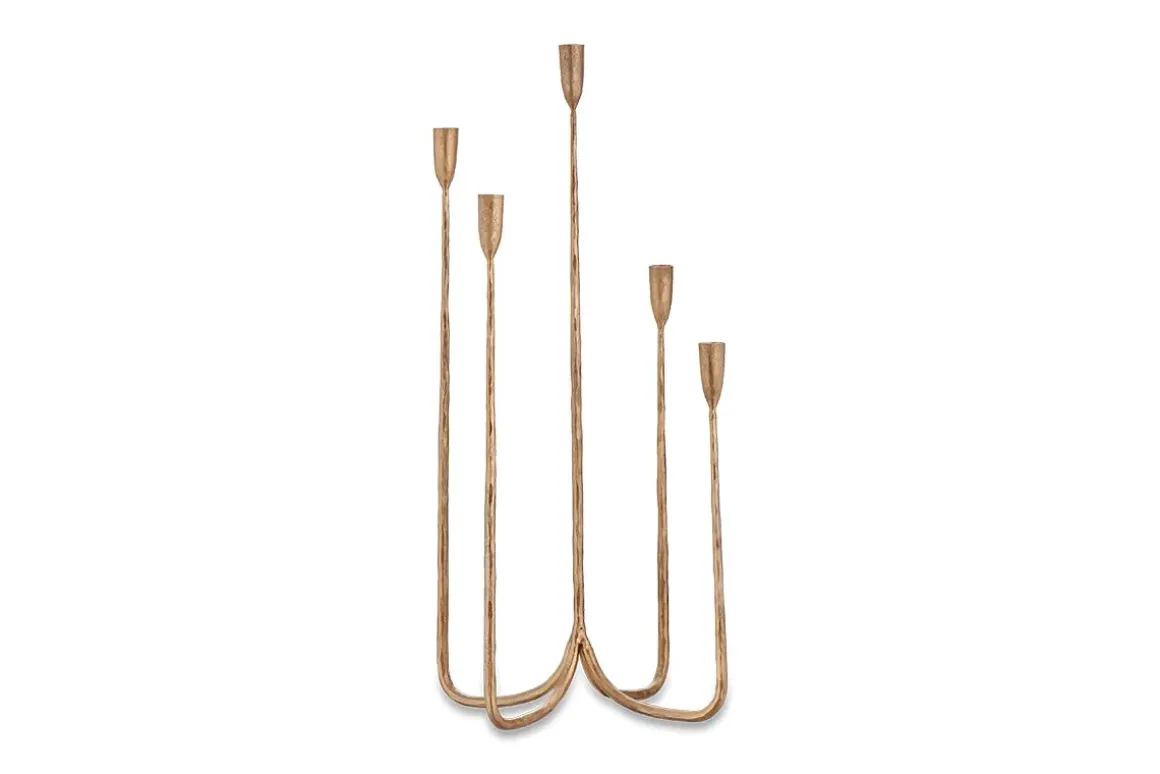 The Mbata cluster candelabra has a discerning design that is ideal as table center piece or sideboard feature. Hand forged from iron and finished in an elegant aged brass tone; the five candles holders are positioned at varying heights. Style with our dinner candles, click here to view the collection.