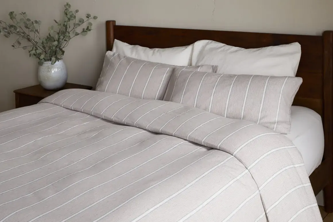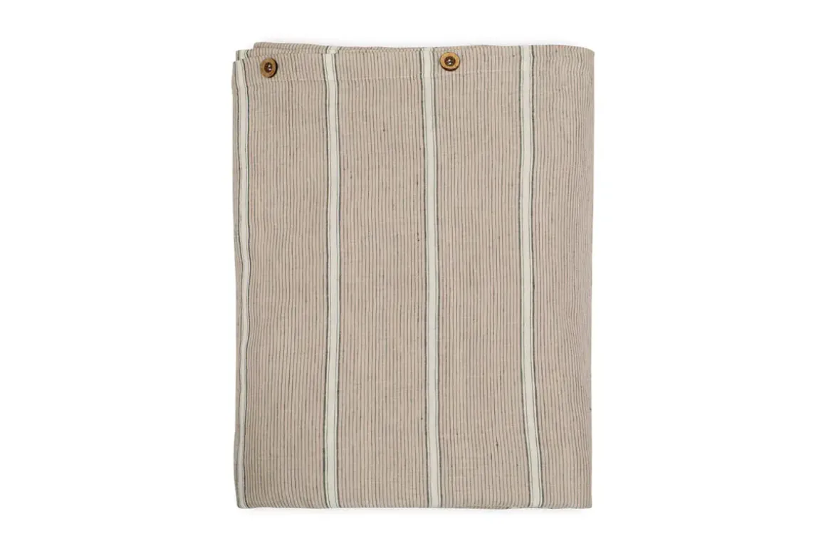 Made in Portugal from a blend of hemp and organic cotton, this duvet cover is naturally breathable, soft, and designed to improve with every wash. Hemp is known for its durability and low-impact growing process, while organic cotton adds gentle comfort to the weave. Finished with a muted grey stripe, this duvet cover offers a refined, easy-to-style look, crafted with care from considered materials. Each piece is neatly packaged in a fabric bag which makes for easy storage, or could alternatively be used as a garment bag.