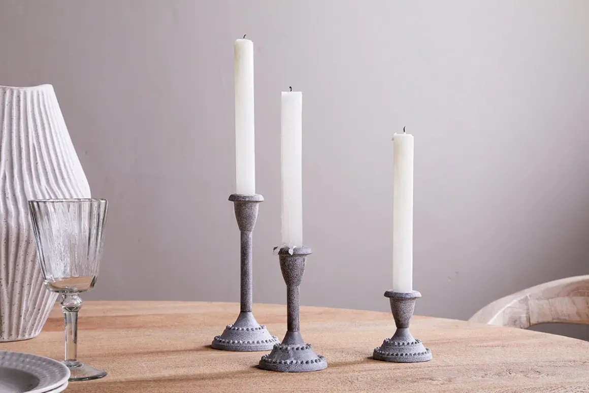 Our Moremi Candle Holders, sold as a set of three, are perfect for styling on a dining table or sideboard. The aged zinc finish gives them a rustic, unique feel, while the delicate design details add a subtle, elegant touch. Easy to mix and match in any space, we love how versatile these candle holders are. Pair with our rustic soy blend Dinner candles.