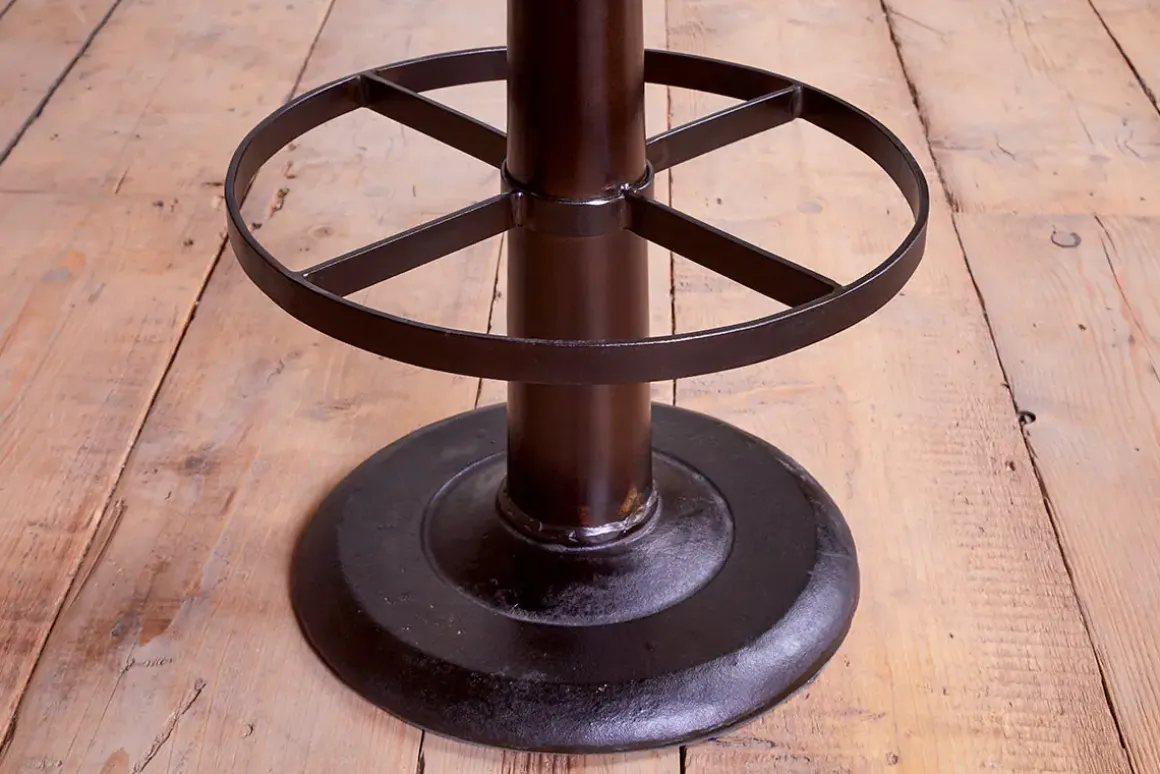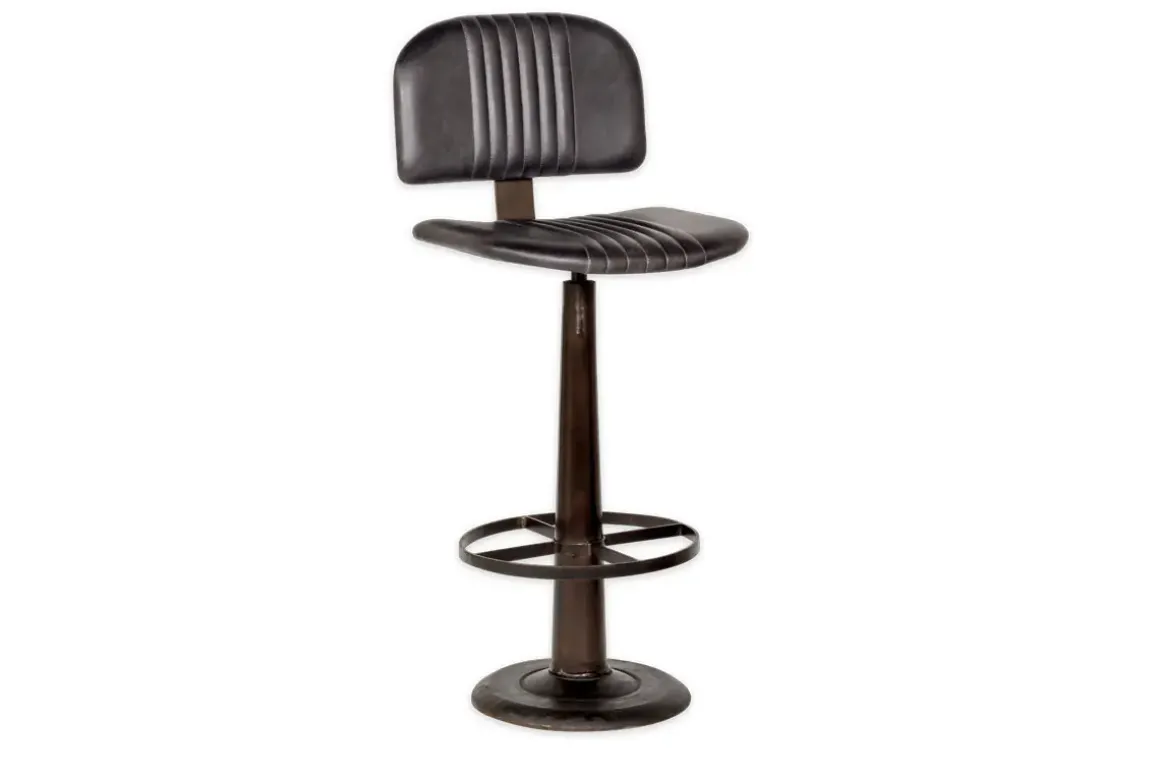 Sophisticated leather upholstery and a sturdy industrial-style iron frame combine to form our elegant Narwana bar chair. The ribbed stitch-work adds an understated design detail to the upholstery, while the circular footrest and stool base create a distinctive silhouette that makes this an eye-catching addition to a kitchen or bar area. The deep aged black tones of the leather complement the dark metalwork, and padded seats add extra comfort for a stylish and timeless piece.