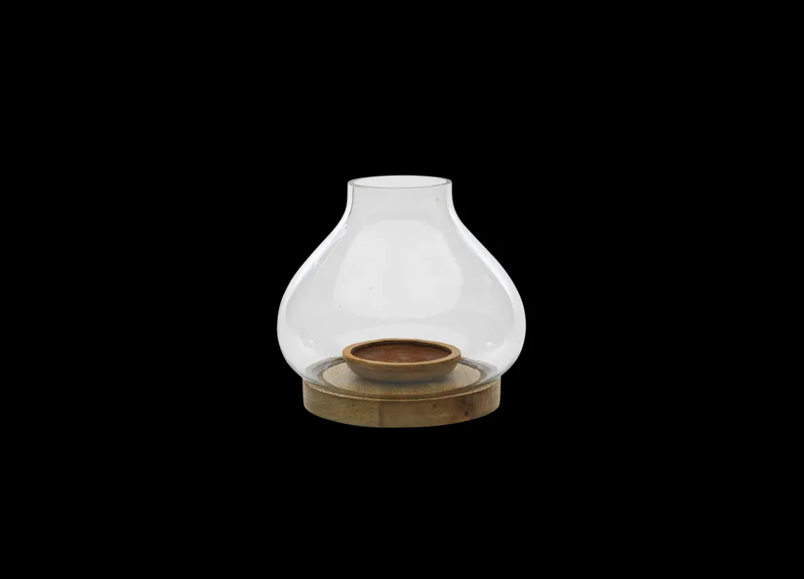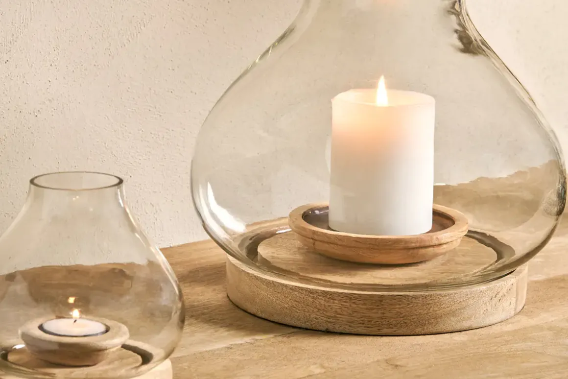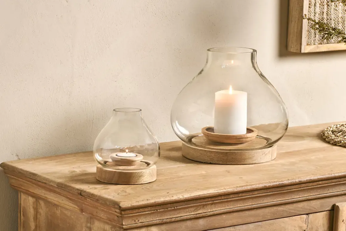 Perfect for atmospheric evenings, our stylish Naryla lanterns have a glass bulb shape that sits perfectly in a solid mango wood base. The elegant contrast of natural wood and recycled glass work beautifully together.