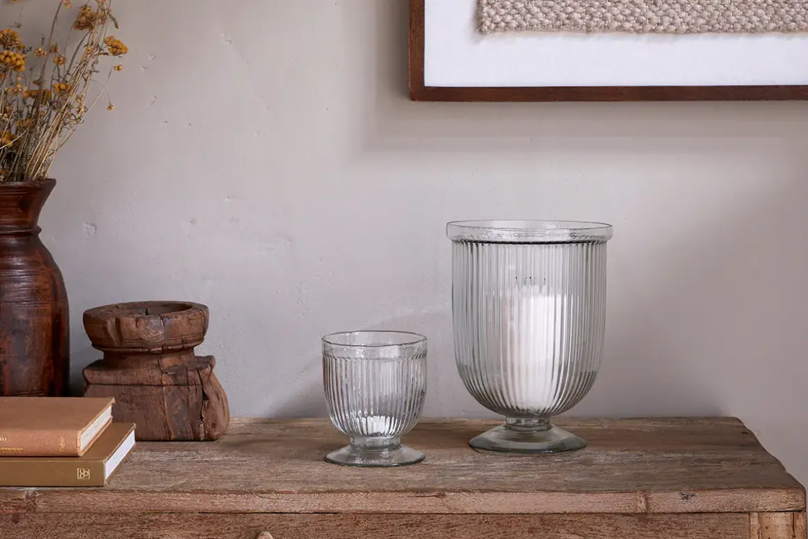 Carefully crafted from recycled glass, our Nia Candle Holders feature a sophisticated fluted design. Once lit, they create a beautifully patterned glow that enhances the atmosphere of any space, and on a stand, the light is elevated, adding an elegant touch to your table. Combining sophistication and sustainability, the Nia Candle Holder is perfect for both everyday use and special occasions. Available in two sizes.