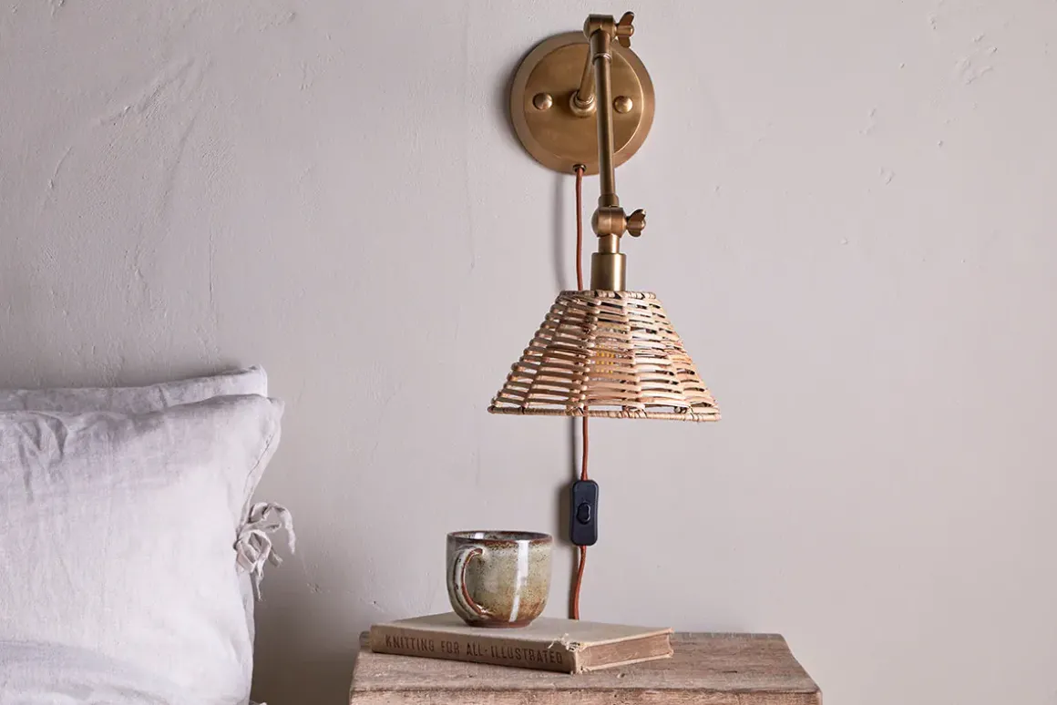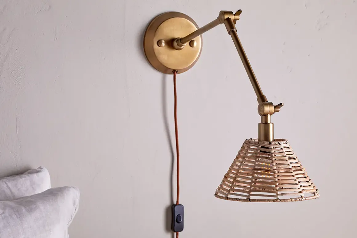 Skilfully handwoven using age-old techniques, the rattan shade has an organic aesthetic which is rich in character and texture. This design also lets the light shine through the gaps in the weave, creating a warm ambient glow. The natural tones of the rattan are complemented by the antique brass finish of the arm. This lamp can be plugged in eliminating the need for an electrician. Position as a pair on either side of a bed for an eye-catching display.
