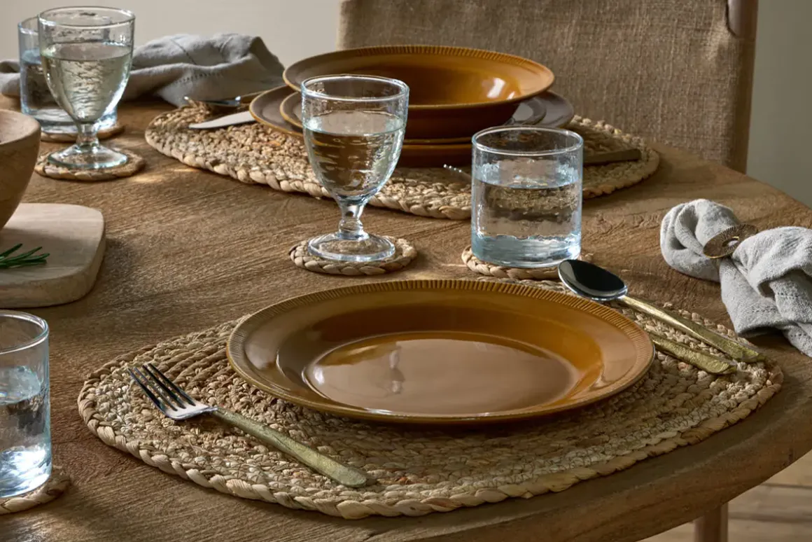 Our new Nuwara dinner plate is a generously proportioned bowl with a simple textured patterning inside that draws the eye. The entire Nuwara tableware collection is beautifully understated in style and design with a distinctive mustard glaze offering a timeless splash of earthy colour at mealtimes. The glaze has a distinctly rich and reflective quality, while the hand-etched line design brings a simple and pared-back aesthetic to the table.