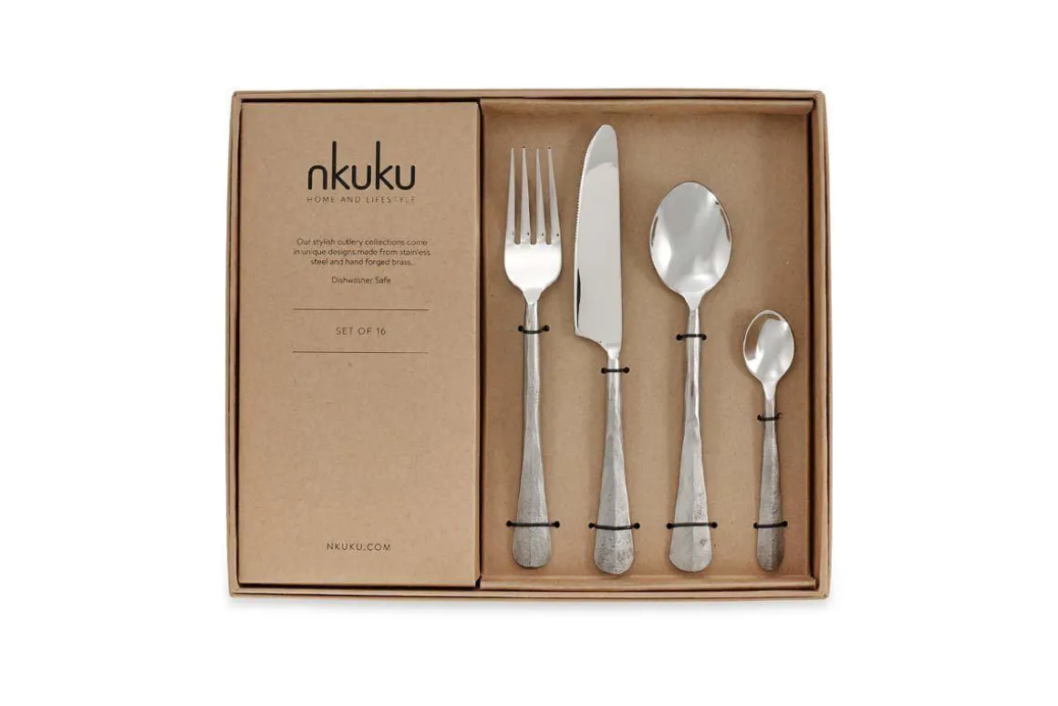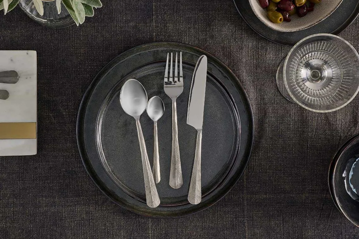 Our Osko cutlery has a rustic artisan feel and each piece has a tactile and imperfect hammered effect. We love the brushed silver finish. This set is made up of 16 pieces, four of each place setting and four teaspoons. This stylish cutlery collection comes in a gift box.