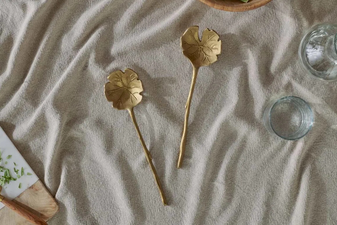 Bringing a delightful touch of natural beauty to a table setting, these Prakriti salad servers have an elegant brush gold leaf design and organically shaped handles that make them a standout piece of serveware, elevating every meal they grace. These would make a wonderfully thoughtful gift.