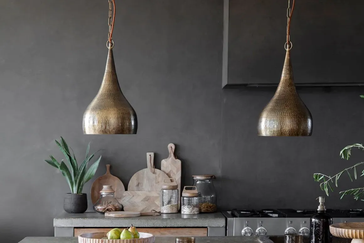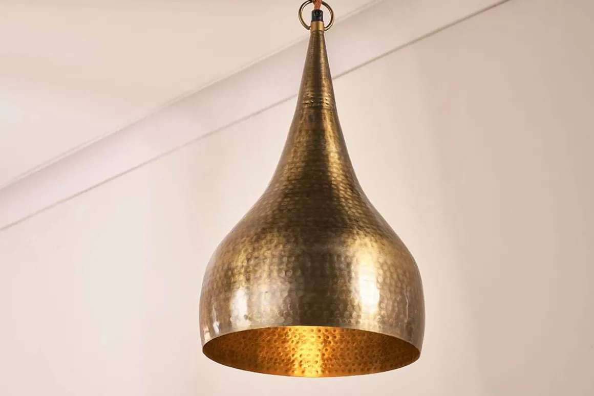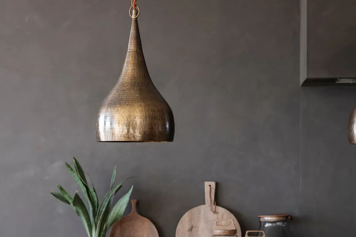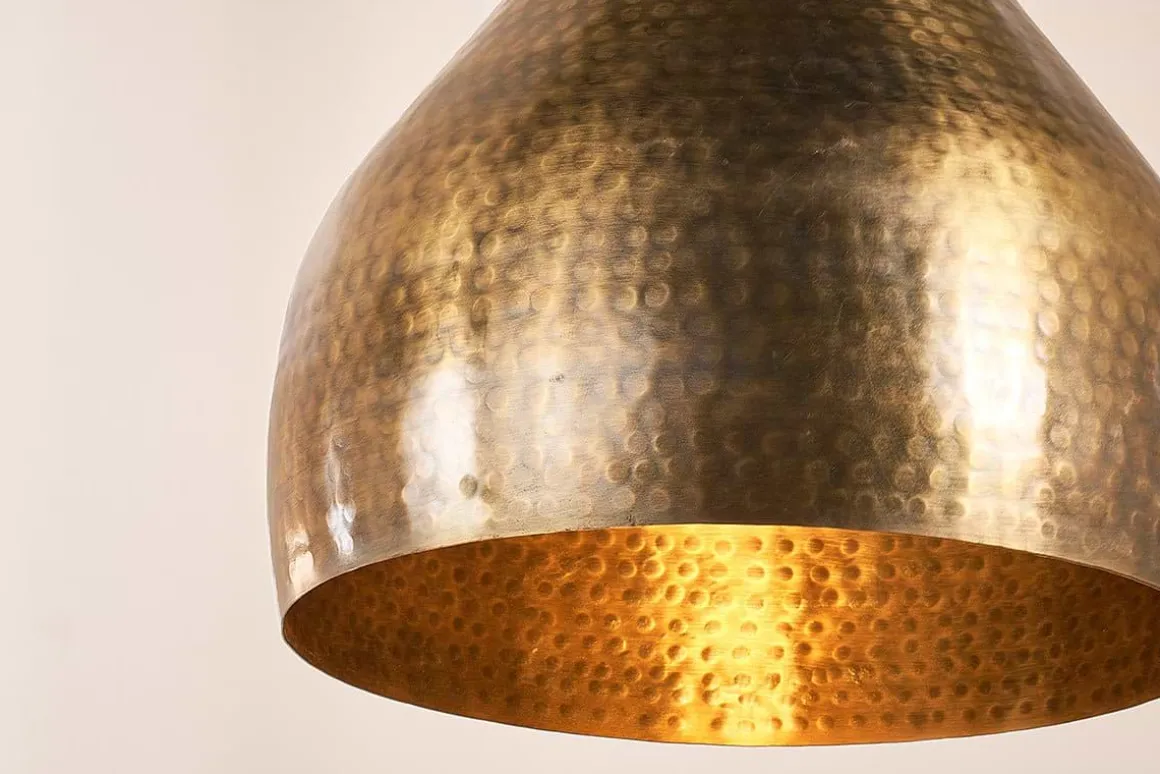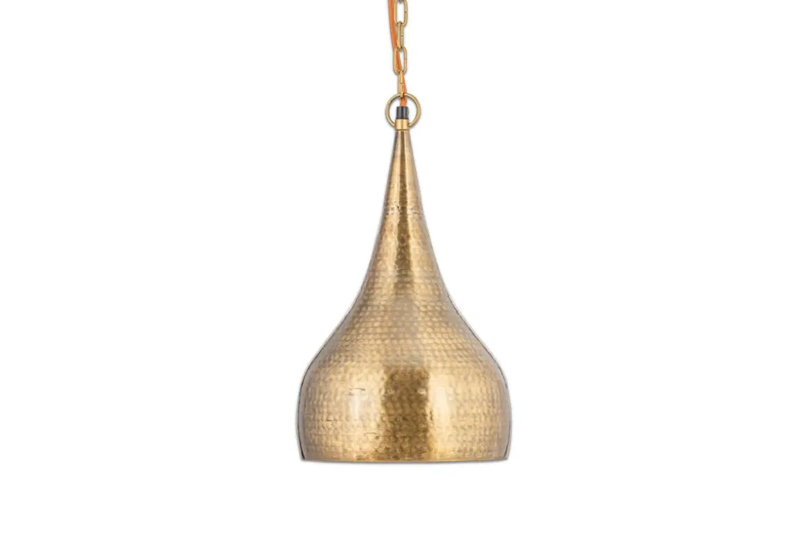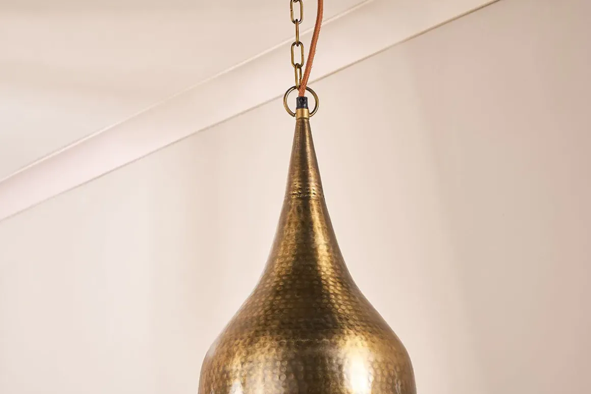 The curvaceous shape of the Quinn pendant light is complimented by its antique brass finish. The metal is skillfully hammered using hand tools, creating an interesting texture. The rich, antique brass finish and textured pattern give the Quinn pendant an antique feel. This smaller pendant light sits well above a dining table or kitchen island. The texture reflects beautifully on the brass finish exterior, showcasing the best of the handmade touches. The wide base of the light releases a generous flow of light. Each pendant has a rust coloured fabric cable and antique brass ceiling rose.