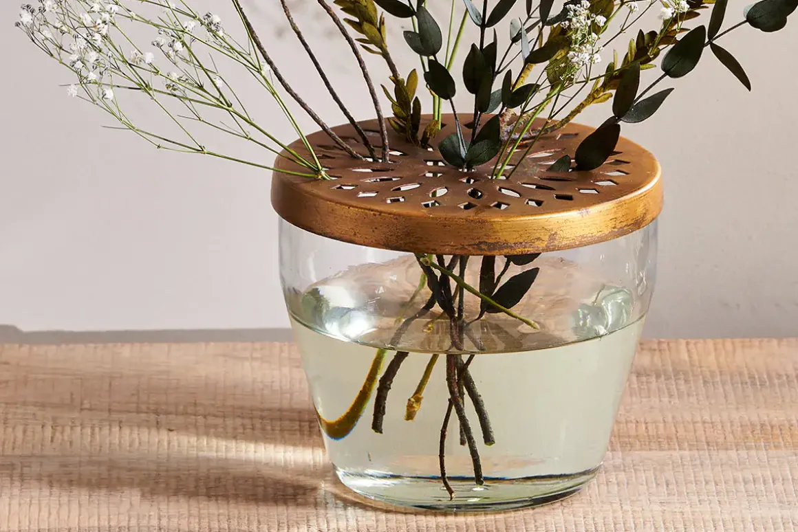 Our circular Ramla vase is decorated with an antique brass lid. The cut out pattern on the lid is designed to hold the stems of flowers and foliage, creating striking displays.