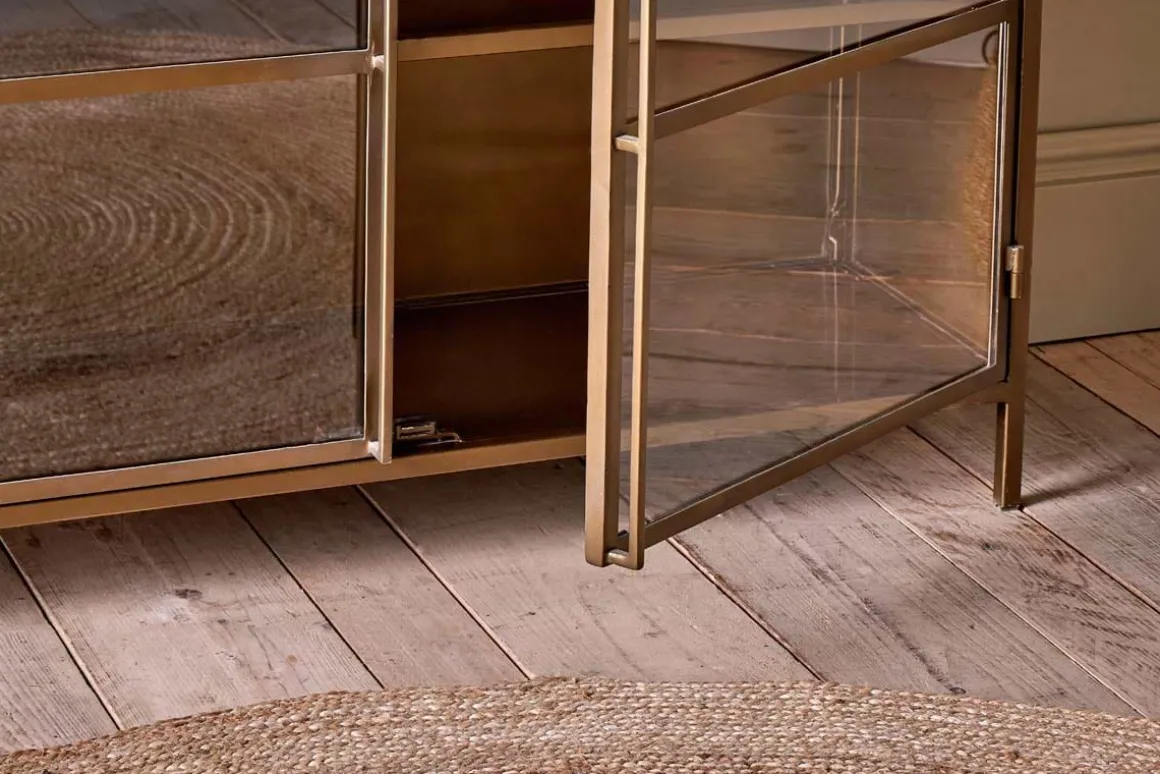 The Ranchi sideboard is perfectly proportioned to accomodate the funcional needs of a media display cabinet, but it works just as well as a striking addition to an entrance hallway or as dining room sideboard. The strikingly simple design is crafted from solid iron and finished in the warm hues of antique brass, with the glass fronted doors opening to reveal a single wide shelf.Dress with a table lamp, photo frame and other decorative accessories to create an attractive display.