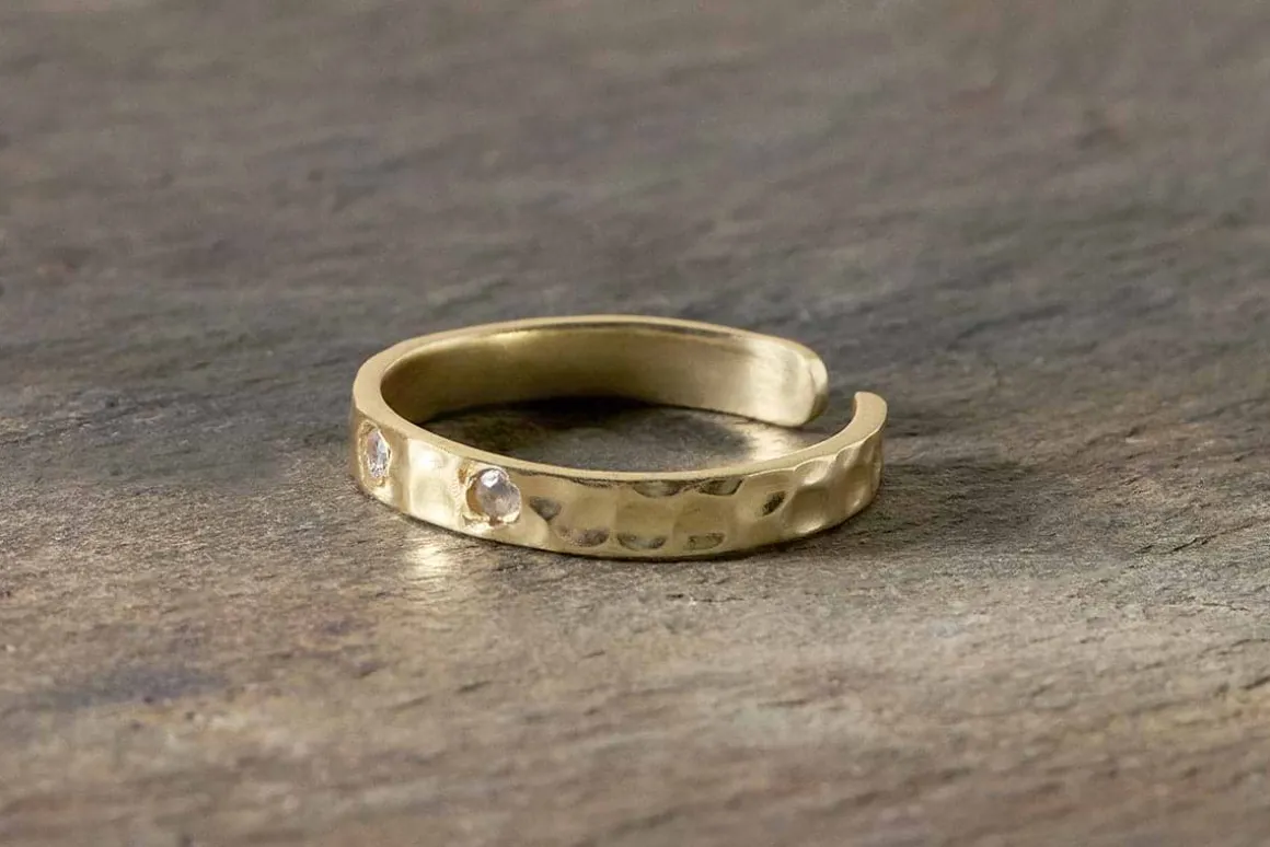 This chunky textured ring is forged from brass alloy with gold plating and three iridescent Labradorite stones set into the face to add extra shimmer to everyday occasions. Labradorite is associated with the throat and third eye chakra and is said to be connected to communication, wisdom and intuition. Hypoallergenic and nickel free. There are matching Ratna earrings available.
