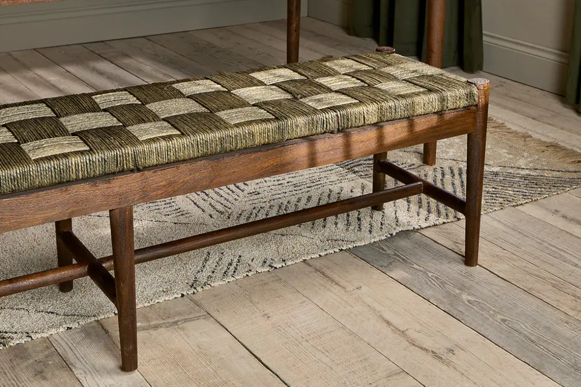 The simple design of our Raunak woven bench combines a solid Acacia wood frame in a dark walnut finish, with a simple woven seat made from Munja grass for a comfortable understated look. Made by carefully weaving the strong fibres around a framework, this bench is created using traditional artisanal skills. Munja grass grows in abundance along India’s riverbanks. It has traditionally been used to make ropes and baskets and is a durable natural material with rich eco-friendly credentials.