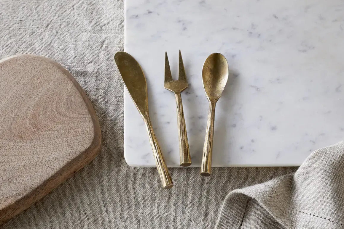 This set of serving cutlery features an antique brass finish that adds warmth and depth to your table. The handles are detailed with a delicate etched design, while the gently textured surface lends a tactile, time-worn character. Perfectly suited for serving cheese, charcuterie or shared dishes, they bring both function and quiet elegance to relaxed gatherings.