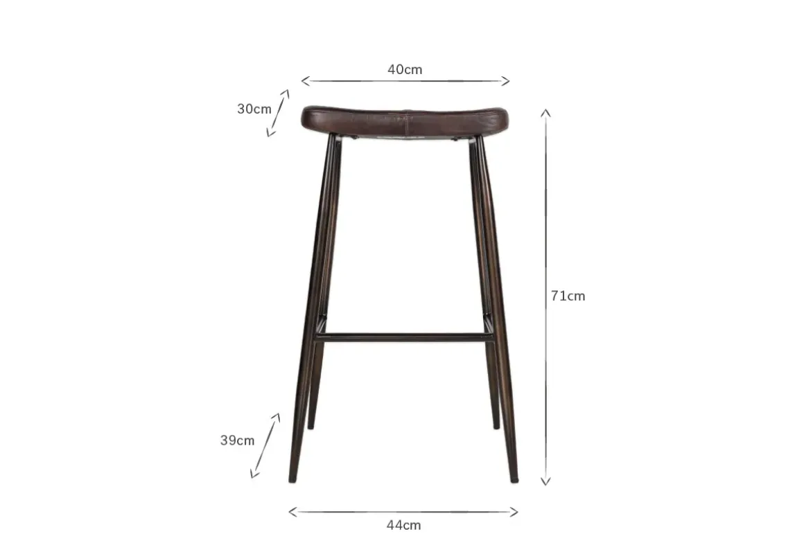 The simple yet sophisticated Samaira counter stool is upholstered in handmade dark brown buffalo leather with an ergonomic, curved seat and footrest for added comfort. The seat is finished with two simple symmetrical stitches, horizontally and vertically, while the simple frame is made from solid iron, bringing you a robust piece that will stand the test of time. The buffalo leather upholstery is a by-product and is dyed using vegetable extract and tree bark which means the leather colour will enrich further with time.
