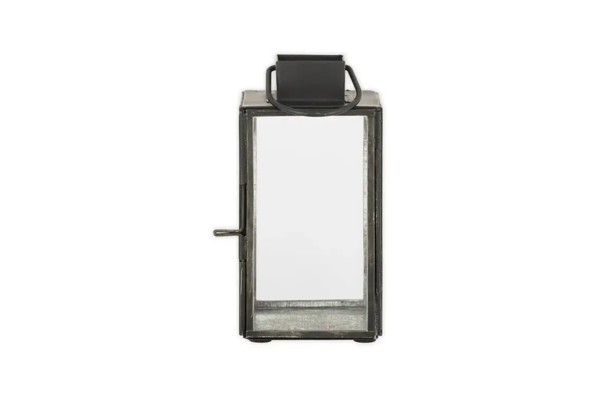 The elegant contours of our smaller Sia lantern are complemented by its antique black metal finish. Designed with the same striking frame and clear glass panels, it-s perfectly sized for a single tealight, casting a soft, atmospheric glow in any corner of the home.
