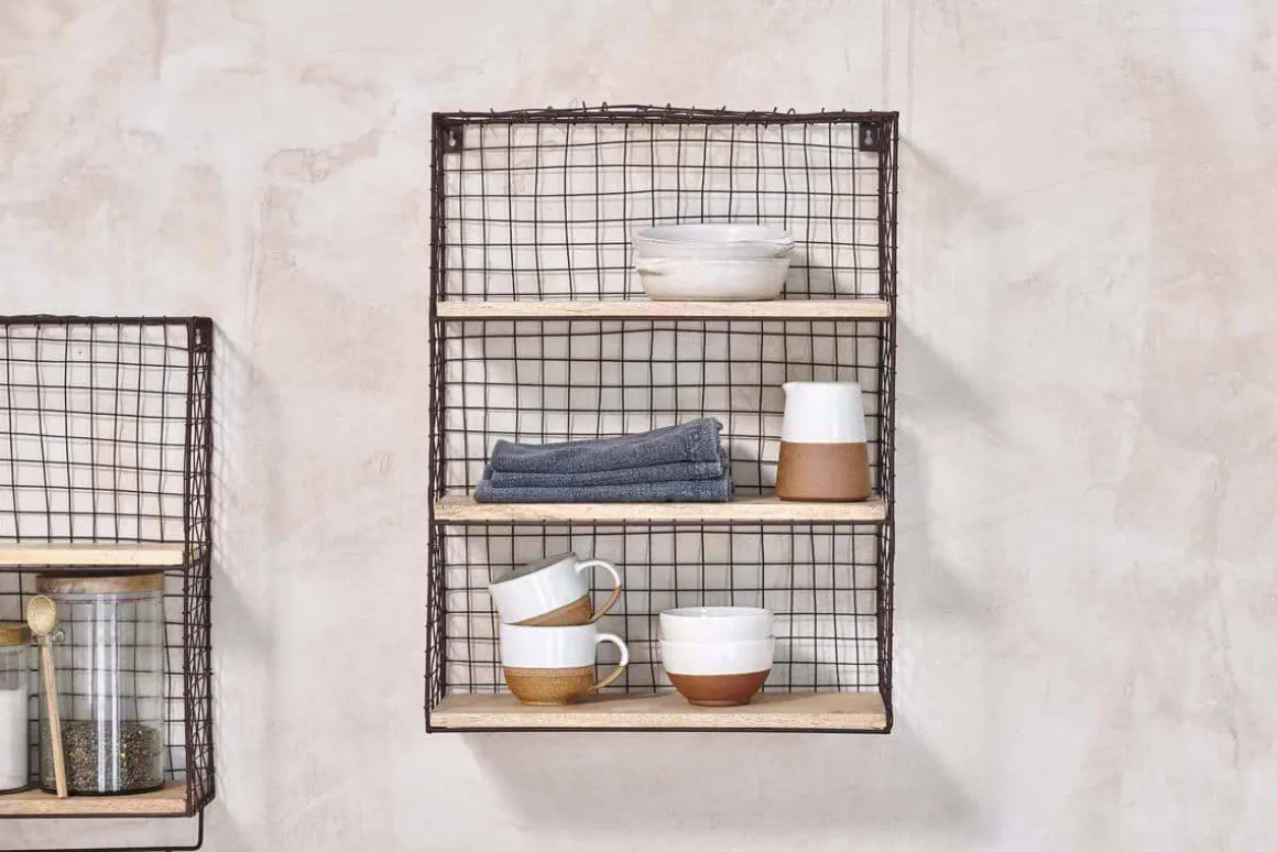 The rust coloured wire of these stylish Tamba wall hung shelves is complemented by the natural mango wood shelves. Style in a kitchen for a functional and eye -catching display.