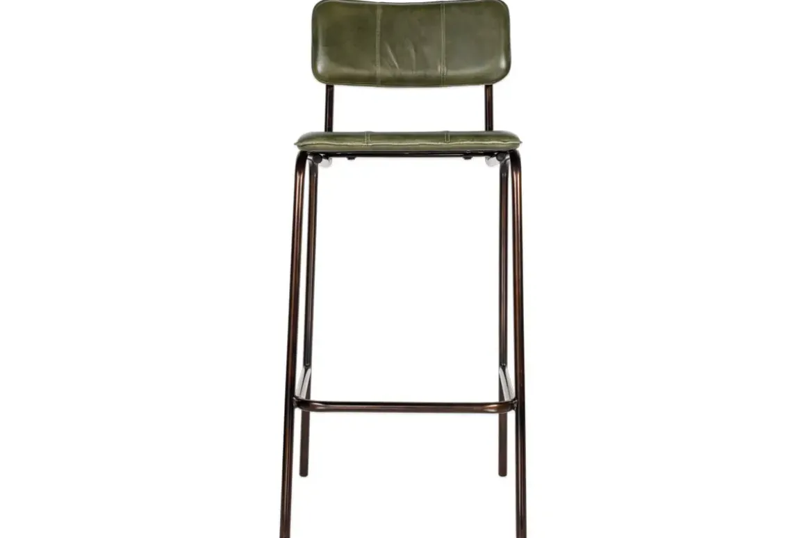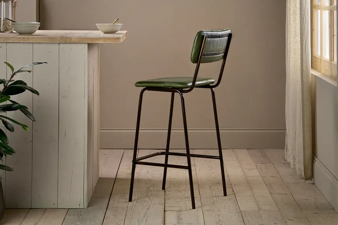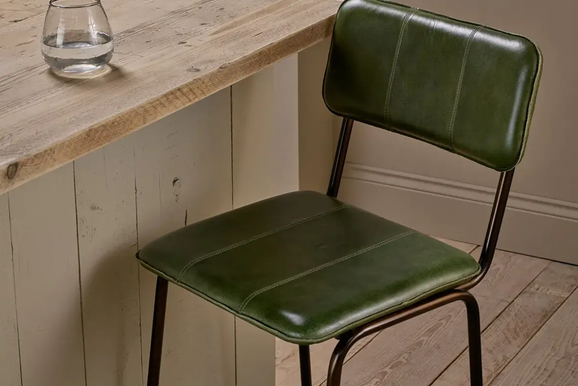 We’ve added this rich green leather counter-height bar chair to our best-selling Ukari collection. This practical, durable, and comfortable design has a simple, solid iron frame and footrest, and a padded seat and back support. Upholstered in handmade buffalo leather, it is stitched to create three panels which adds a stylish design detail to the piece. Designed to work with a kitchen island, counter or breakfast bar, the Ukari counter chair tucks neatly under a kitchen counter top. The leather upholstery is a by-product and is dyed using vegetable extract and tree bark which means the leather colour will enrich further with time. The Ukari collection includes dining chairs and counter stools in a selection of rich colours.