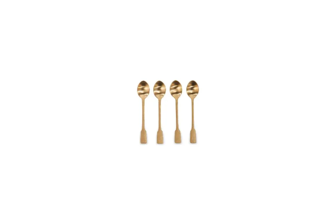 An elegant gift, and a practical accompaniment to our dinner service, these hand forged Veeta teaspoons, have a refined elegance and characterful charm. The stainless steel spoon heads are dressed with tactile, brushed gold handles. The set comes beautifully gift boxed.