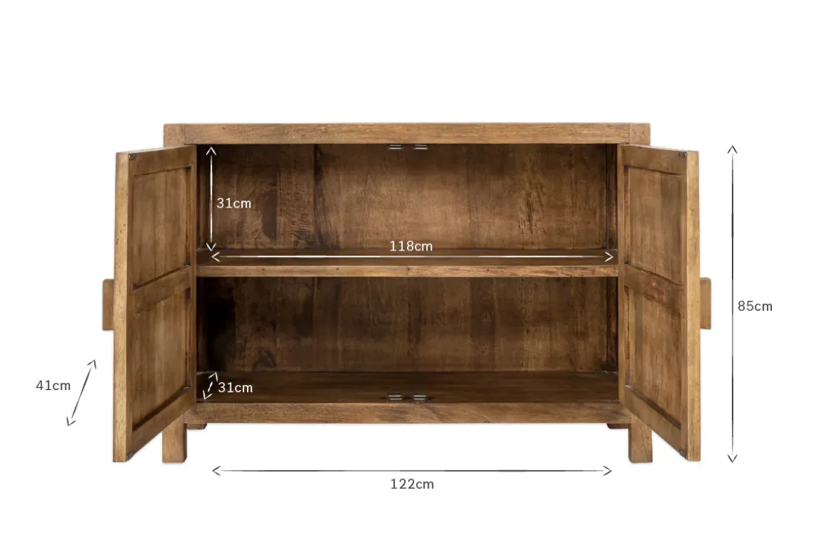 Our Yasha sideboard, made from sustainable mango wood, has a beautiful patina and is finished with a walnut wash. Block handles and a simple reeded design on the front panels add interest and texture. The piece is raised off the ground giving it a light and airy feel, perfect for a hallway, landing or bedroom. There is one inner wooden shelf providing storage. A cabinet is also available in the collection.