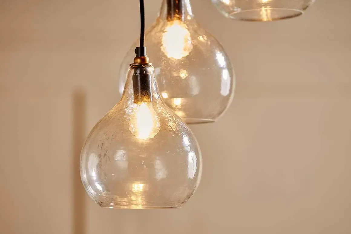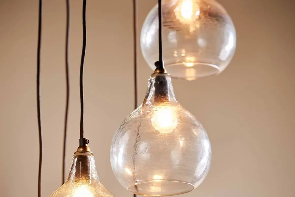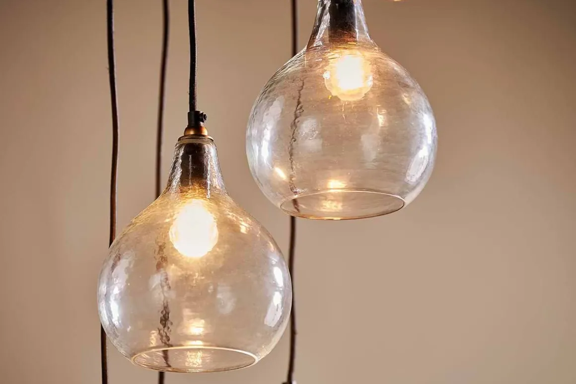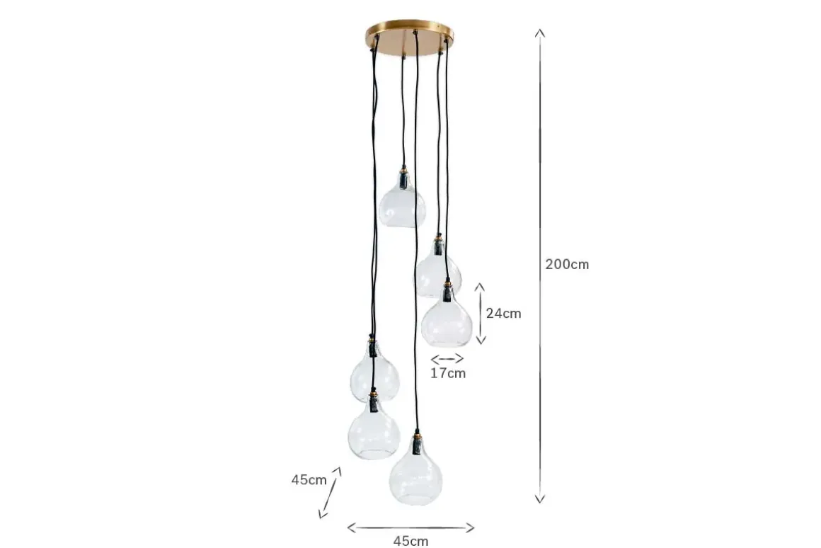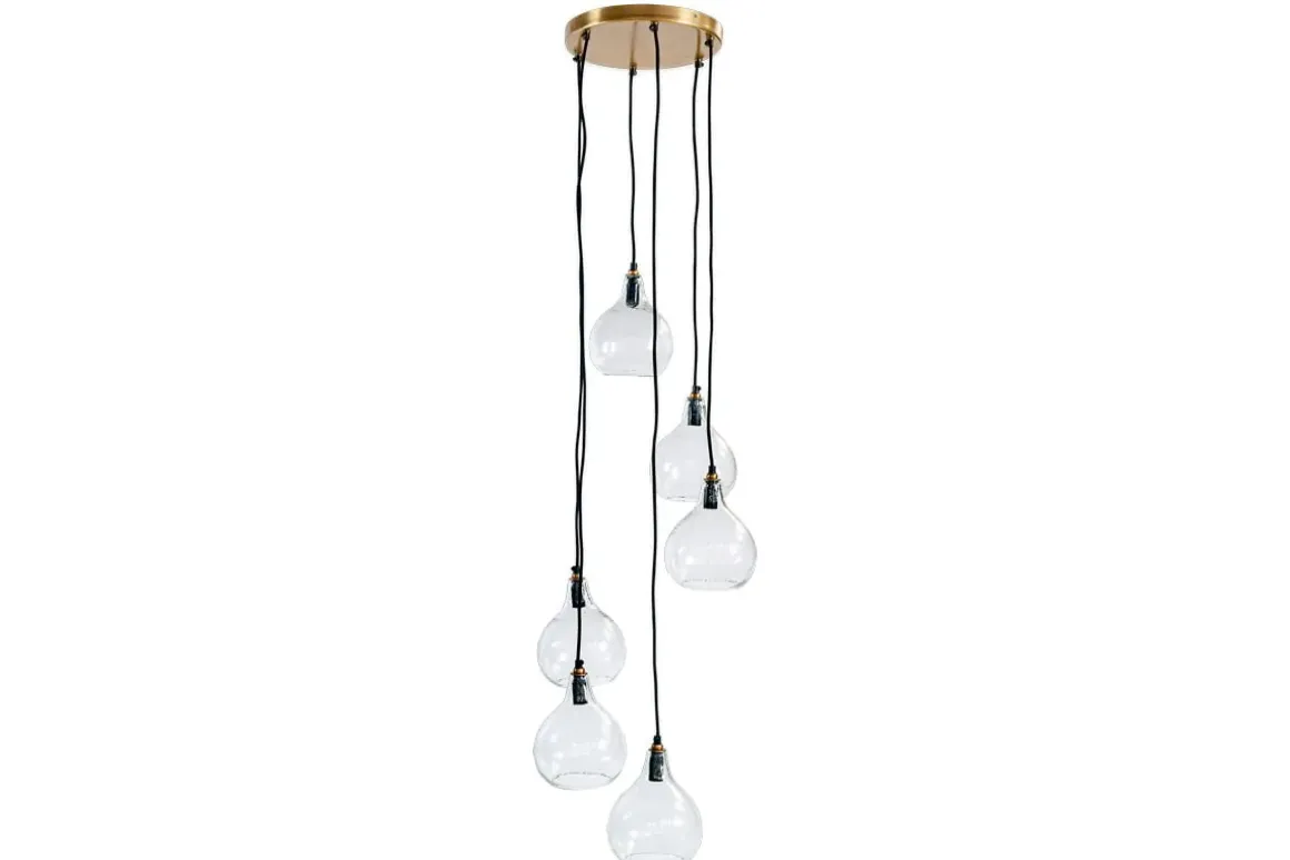 The Zia statement cluster pendant makes a standout centre piece. The collection of six recycled glass tear drop shaped lights at varying heights provides a contemporary alternative to a chandelier. Style them in an entrance hallway or stairwell as a key focal point or display above a dining table. Each of these Zia pendants is made from recycled glass, the black fabric cables affixes to an attractive brass ceiling rose.