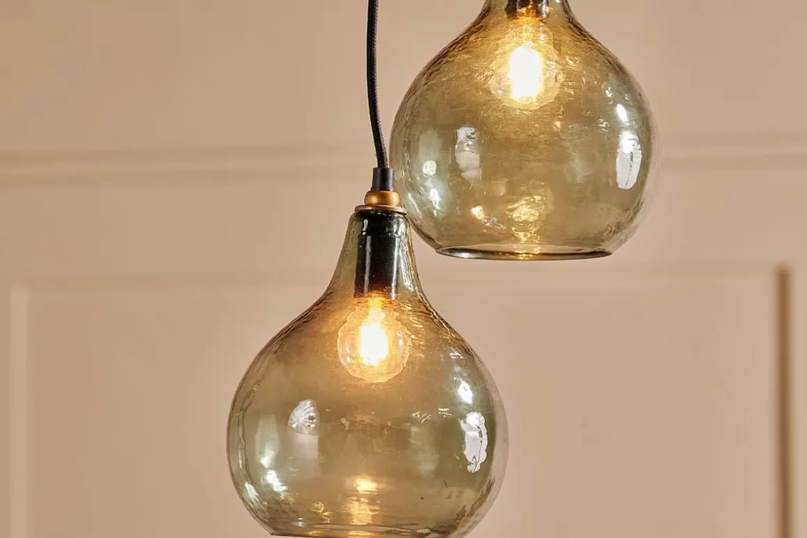 The smoke-coloured hues of the Zia cluster pendant light combine beautifully with the hammered finish of the glass. Each tear shaped pendant is expertly crafted from recycled glass. The six pendants hang at varying heights, creating a dramatic display that promises to enhance a dining space or hallway. The Zia cluster pendants have a black fabric cable and aged brass ceiling rose that add the finishing touch to this unique feature light. The design of the Zia is well suited to high ceilings.