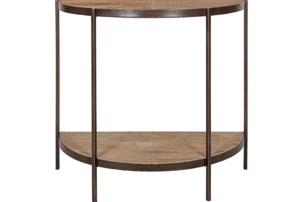 This striking half moon console table combines natural warmth with sculptural form. The mango wood top showcases an intricate carved design, adding texture and interest, while the rustic brown iron legs provide a bold contrast. Its slim profile makes it a perfect fit for hallways, entryways, or any space in need of a stylish accent.