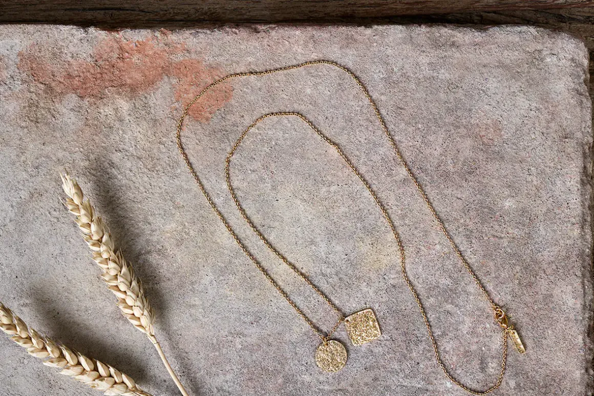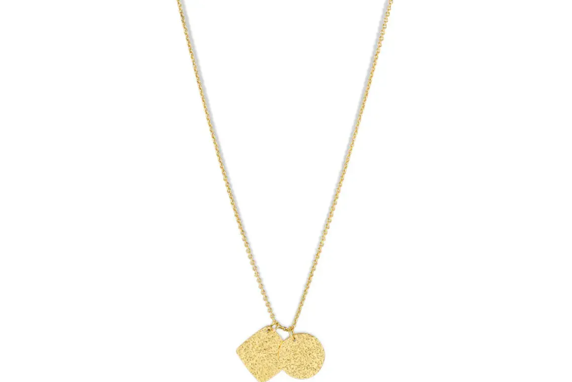 Our Aavani gold plated necklace has a contemporary aesthetic that can be worn alone or paired with other pieces from with our jewellery collection for a stylishly eclectic yet considered look. Its bold geometric shapes are eye-catching in their simplicity, and the hand-hammered design gives a naturally textured finish that catches the light and adds detail without fuss. This is a longer length chain for versatility when styling.