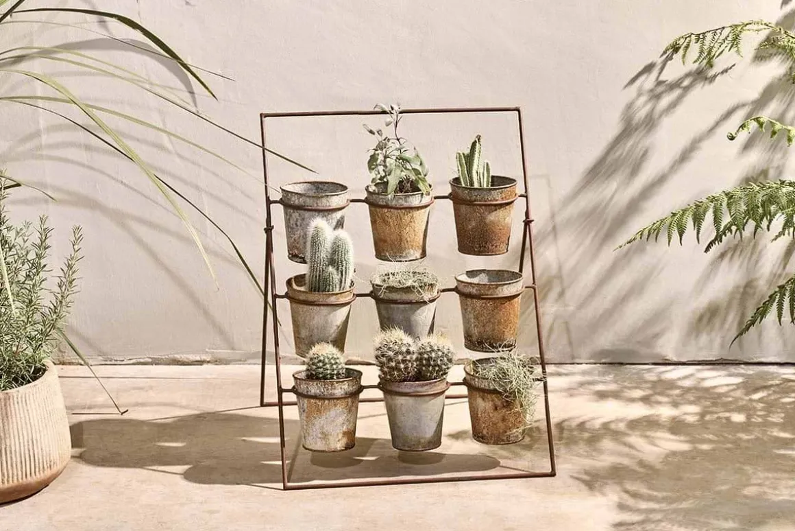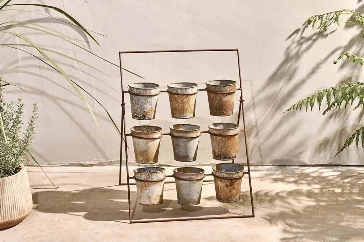 This Abari planter stand is the perfect way to dress up an outside area. Freestanding, the aged zinc frame holds nine individual plant pots. Each pot is crafted from aged zinc, rich with a rustic patina that will enhance and weather over time. The Abari stand looks stunning filled with herbs and plants and is perfect for any garden, terrace or balcony.