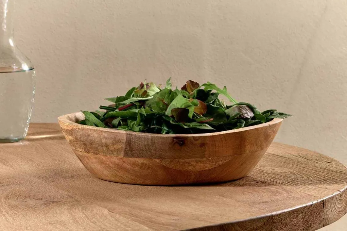The striking organic shape of our Adar mango wood bowl is reminiscent of traditional Indian antiques and will add authentic and unadorned simplicity to your kitchen countertop or as a centrepiece to a table. Entirely food-safe, this piece makes a perfect fruit bowl or is ideal for serving salads and vegetable dishes. The variety of sustainable mango wood offcuts used to create each bowl gives a unique look and feel to each one.