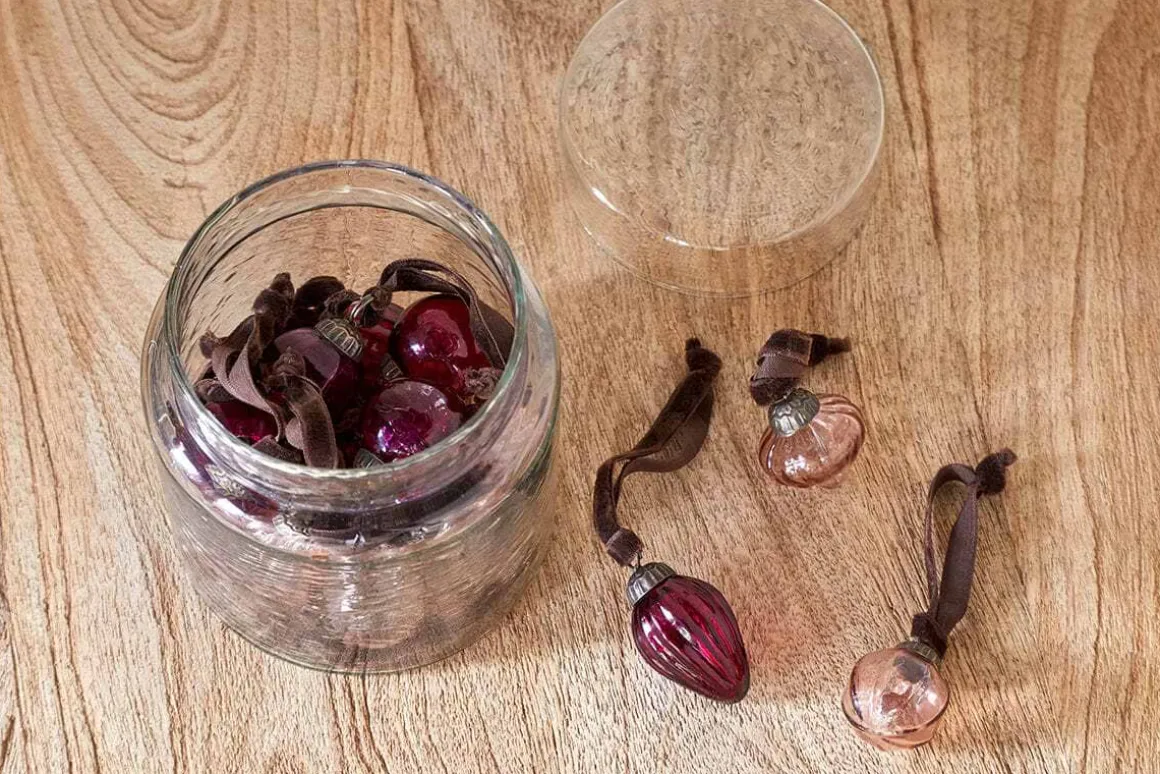 This elegant collection of mini baubles comes in a beautifully curated new colour combination, perfect for adding warmth and depth to your festive decor. Each bauble is finished with a rich brown velvet tie, offering a sophisticated touch for decorating trees, wreaths, or table settings. Neatly stored in a stylish, recycled glass jar, they-re easy to display and reuse year after year.