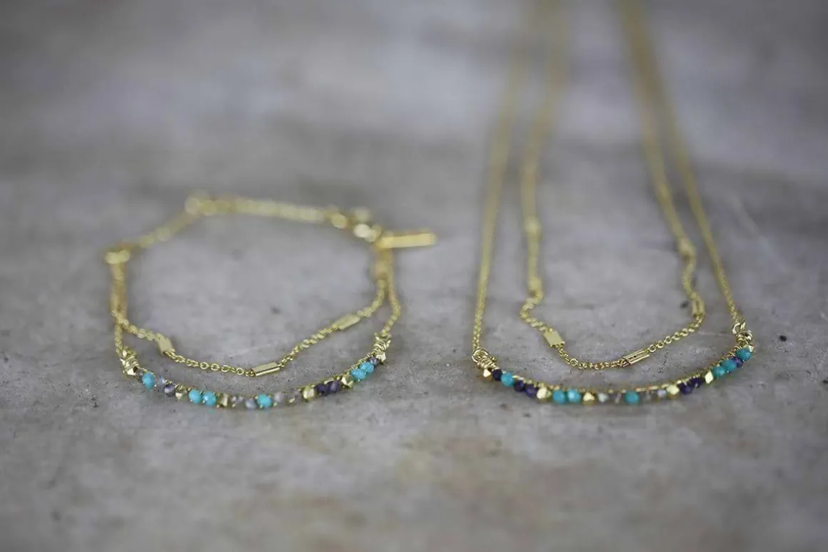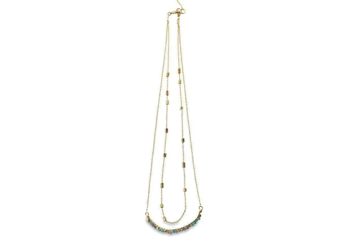 This exquisite Aja necklace combines the natural stones of lolite, labradorite and calcydone with a gold plated chain. This stunning design has a double strand design that sits beautifully on your neck. Our jewellery collections are handmade by a fair-trade enterprise in Rajasthan. The artisans used traditional techniques honed over generations.