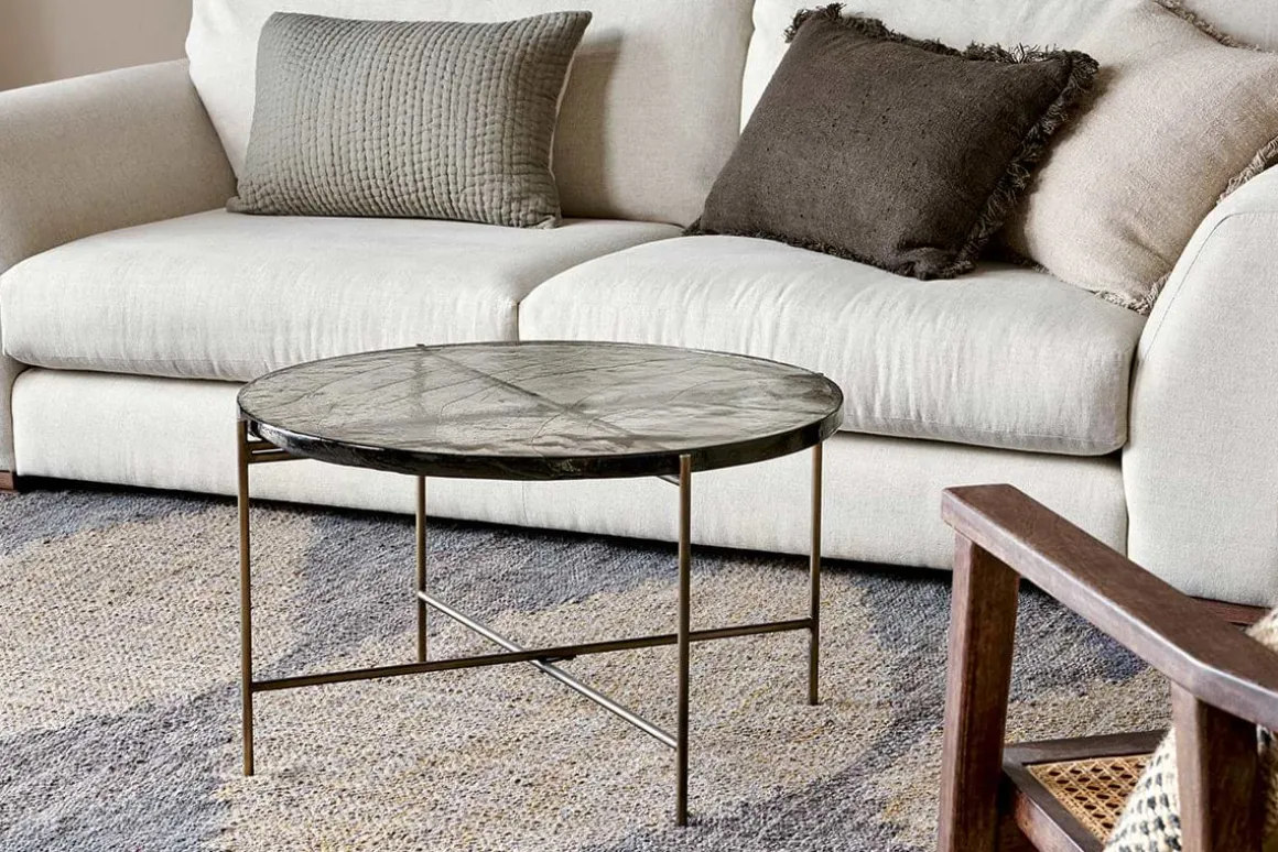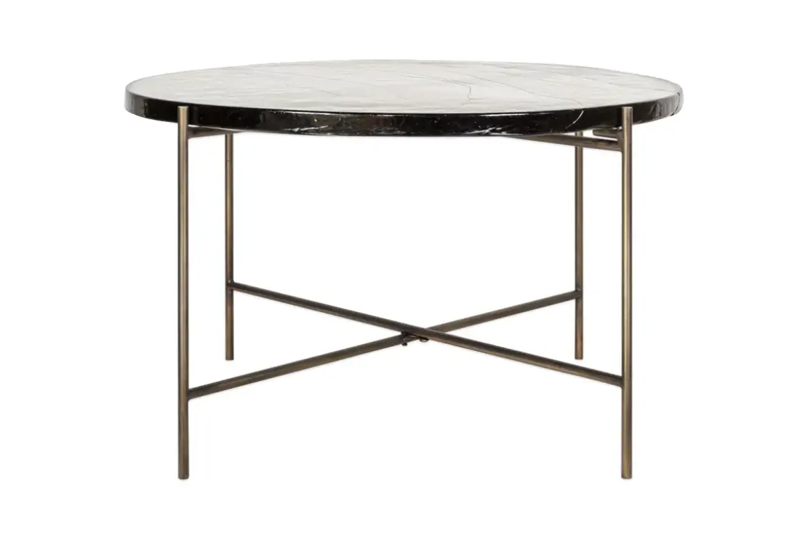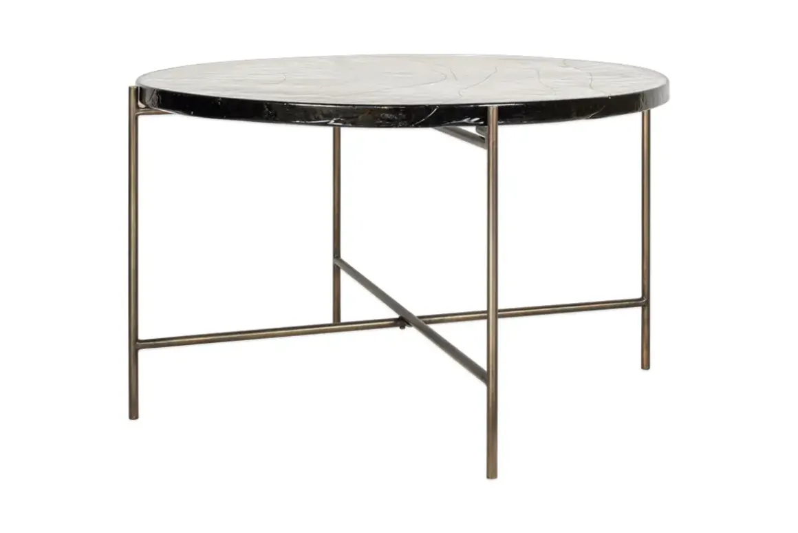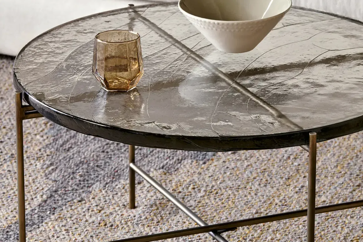Our circular Aluva Glass Coffee Table has a geometric, timeless design with a base forged from solid iron with an antique brass finish. Perfect in any living space, it becomes a focal point for the room, adding a sophisticated feel to a scheme. The separate glass top slots neatly onto the frame and has been sand cast, a technique dating back to the 15th Century where the design is carved into sand and molten glass poured in. When cooled, the sand is removed to reveal the cast glass to be smooth on the surface but with a wave like pattern and the occasional air bubble, giving the finished piece a beautifully textured, unique finish. There is a matching side table in the collection. Click here to view.