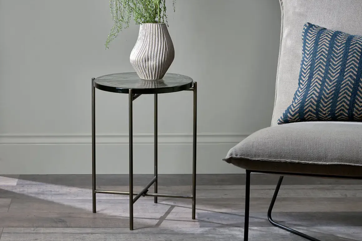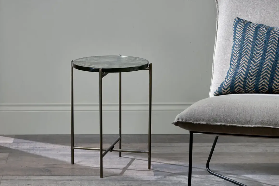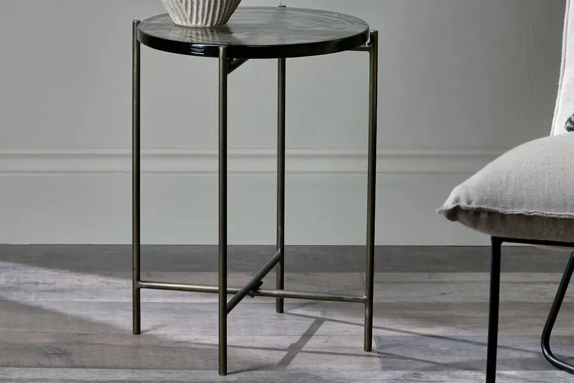 Our sophisticated Aluva Glass Side Table has a geometric, timeless design with a base forged from solid iron that has an antique brass finish. Perfect in any living space, place it next to a reading chair with a table lamp, or use it as an occasional table. The separate glass top slots neatly onto the frame and has been sand cast, a technique dating back to the 15th Century where the design is carved into sand and molten glass poured in. When cooled, the sand is removed to reveal the cast glass to be smooth on the surface but with a wave like pattern and the occasional air bubble, giving the finished piece a beautifully textured, unique finish. There is a matching coffee table in the collection. Click here to view.