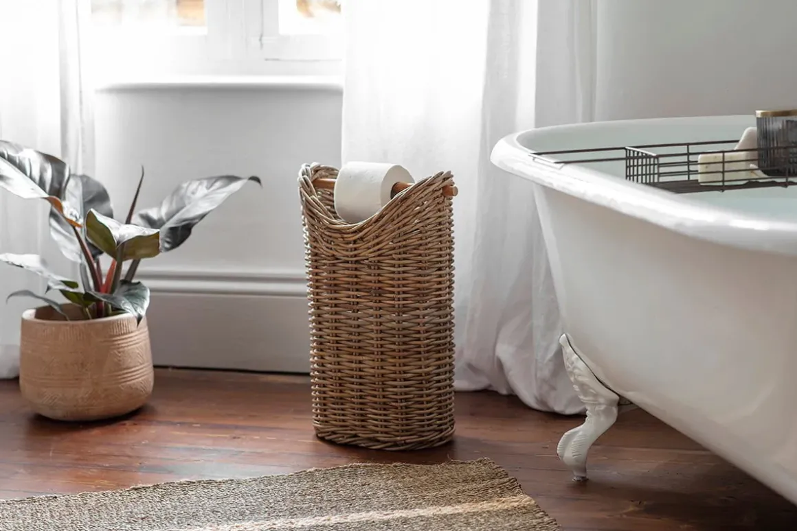 The Amandi rattan toilet roll holder adds a natural and calming tone to a bathroom or lavatory. The warm tones of the natural rattan have been expertly woven using a traditional Indonesian basket technique. The bamboo rod removes easily to hold a loo roll and the deep basket is designed to store a good supply of rolls.
