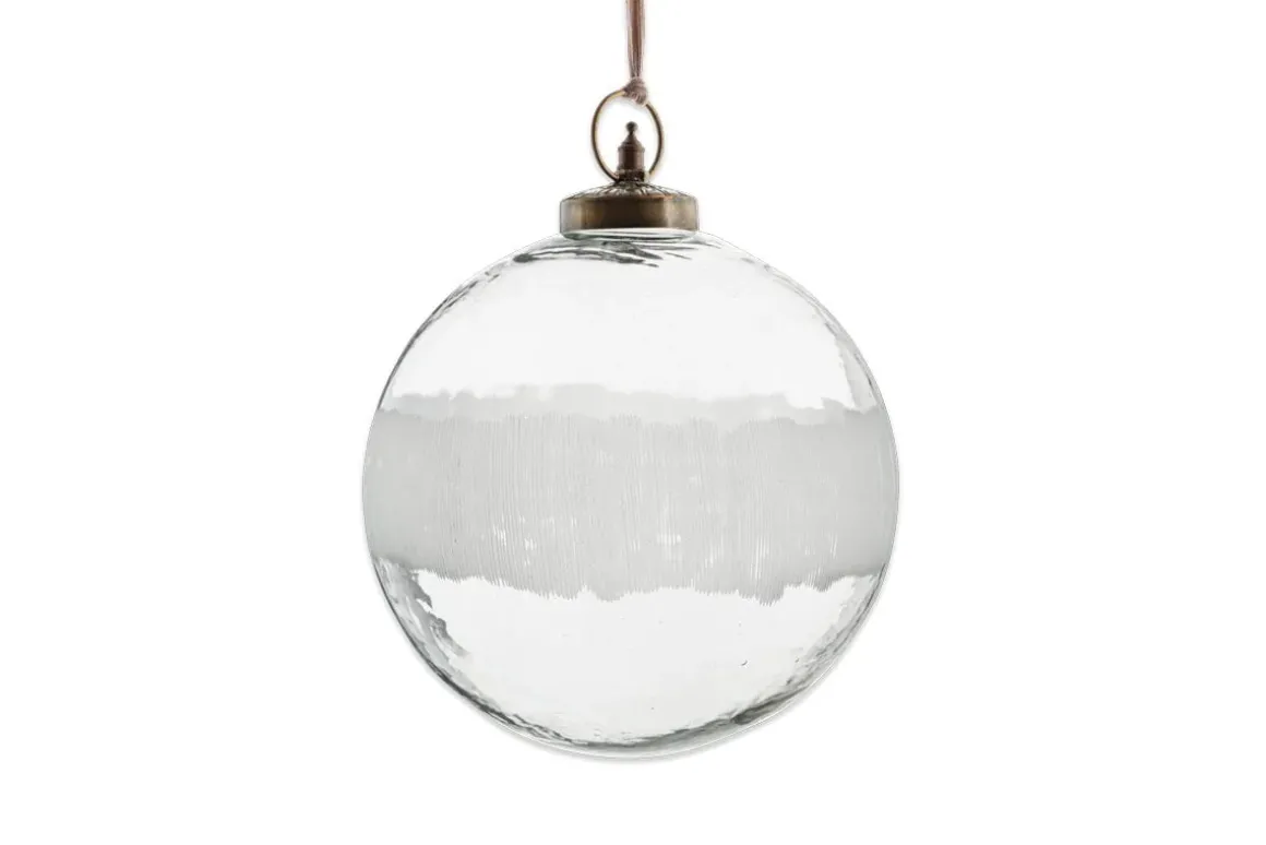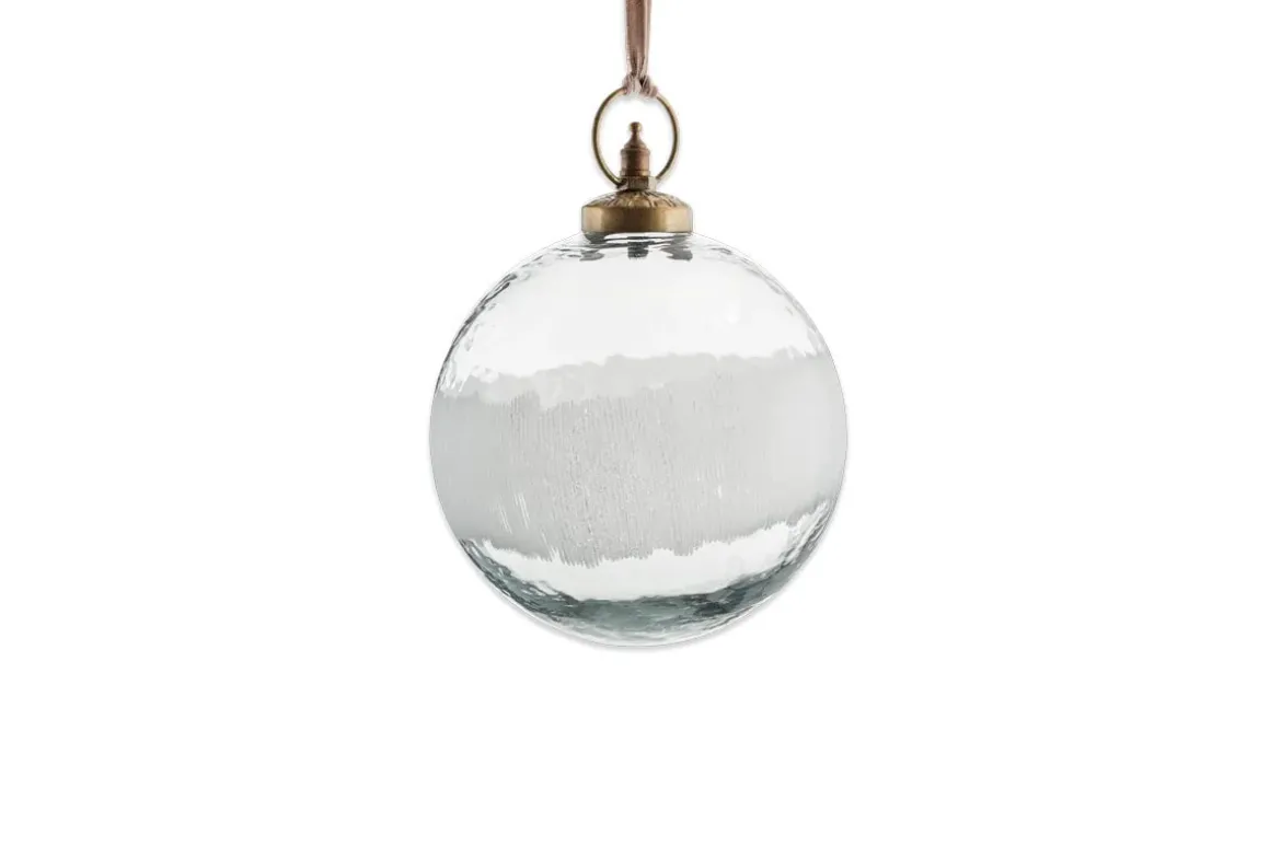 Our Anara round baubles are crafted using recycled hand blown glass, a traditional method of glassmaking that has been used by artisans for centuries. The glass is washed to remove any impurities before being melted down and blown to create beautiful organic shapes. The delicate clear glass is decorated with a striking frosted design that is entirely hand-etched. We love these baubles because they are both stylish and sustainable – and they look even more magical when they reflect the light. Their size means they look striking when suspended from your ceiling or strung together as a festive garland over your mantlepiece. Try styling groups of different sizes and shapes for an eye-catching display. They’re available in two sizes – small and large – and have a luxurious cotton velvet tie.