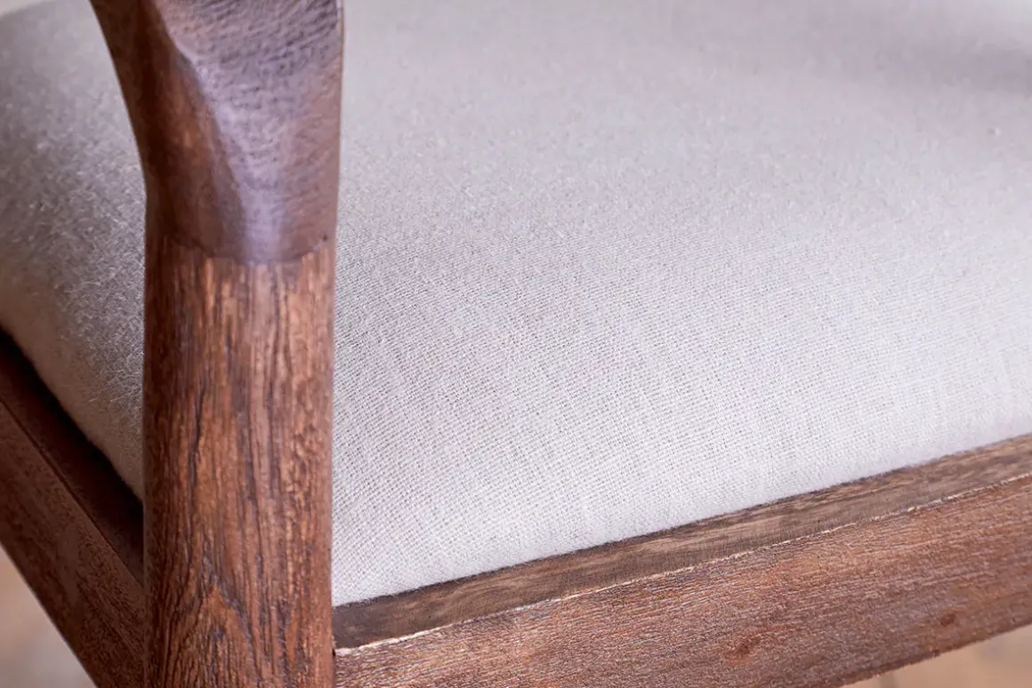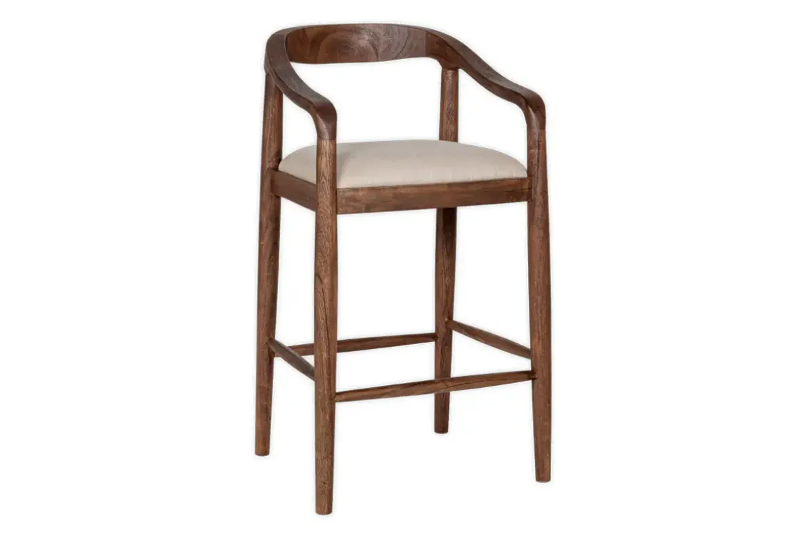 We’ve added an elegantly upholstered counter chair to our classic and timeless Anbu collection. Hand carved from solid acacia wood with a deep walnut finish and natural, textured linen seat, the organic curve of the frame and stark simplicity of the legs and footrest have an effortless design appeal that look beautiful around a kitchen counter or bar area. Part of our growing Anbu collection, this design is also available in a contrasting mango wood.