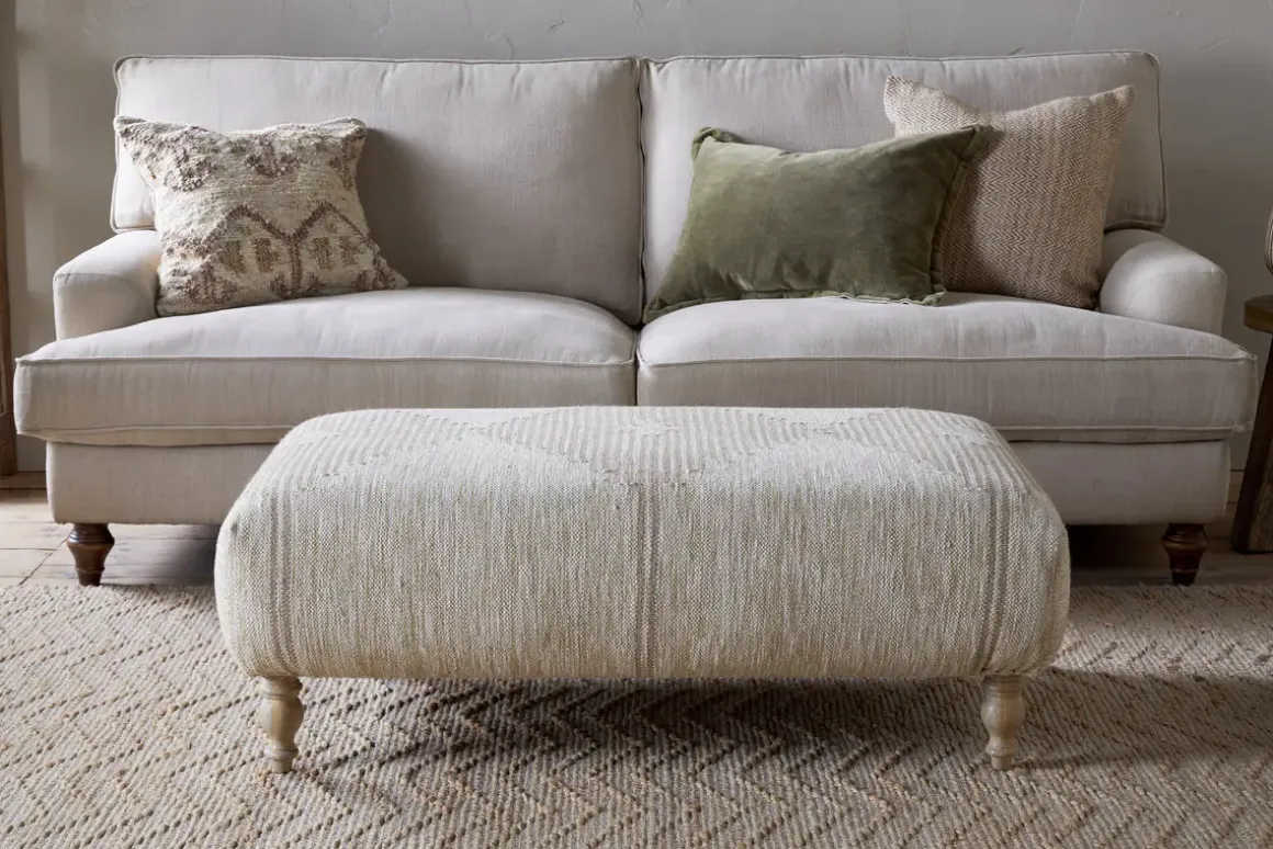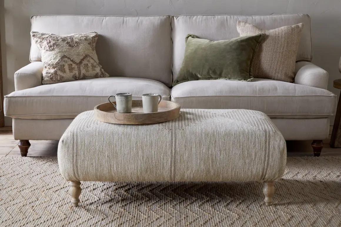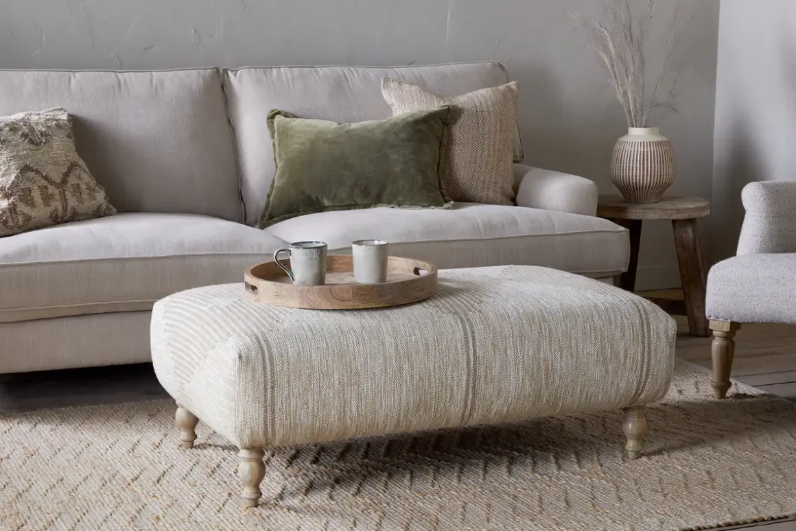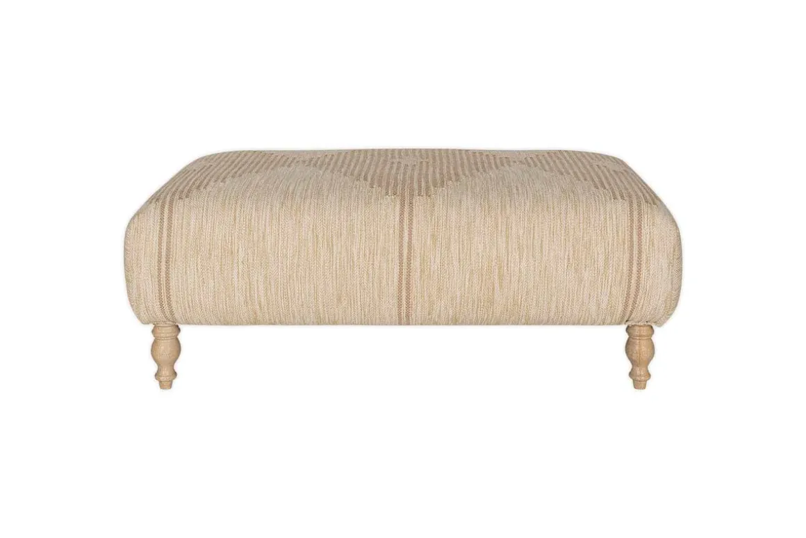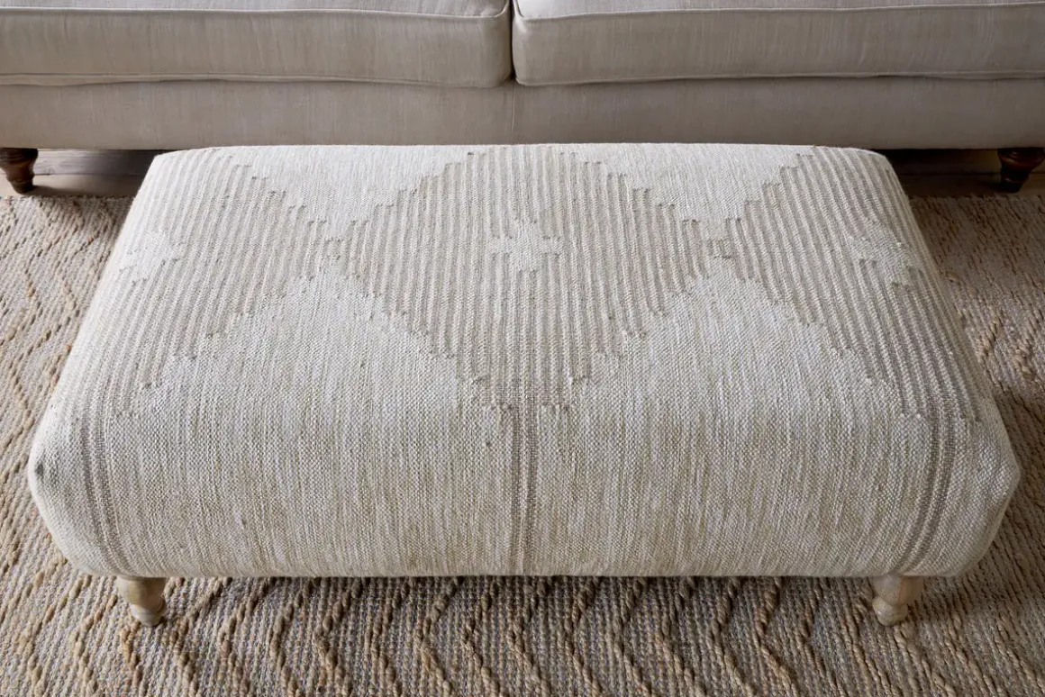 Upholstered in a cotton and jute blend with a traditional kilim design, this ottoman adds soft texture and pattern to any space. The muted natural tones bring a calming presence, while the cushioned top offers a comfortable spot to rest your feet or use as an occasional seat. Finished with sturdy wooden legs, it-s a versatile and stylish accent for any living room or snug.