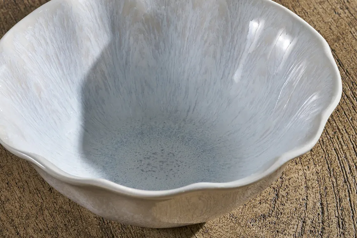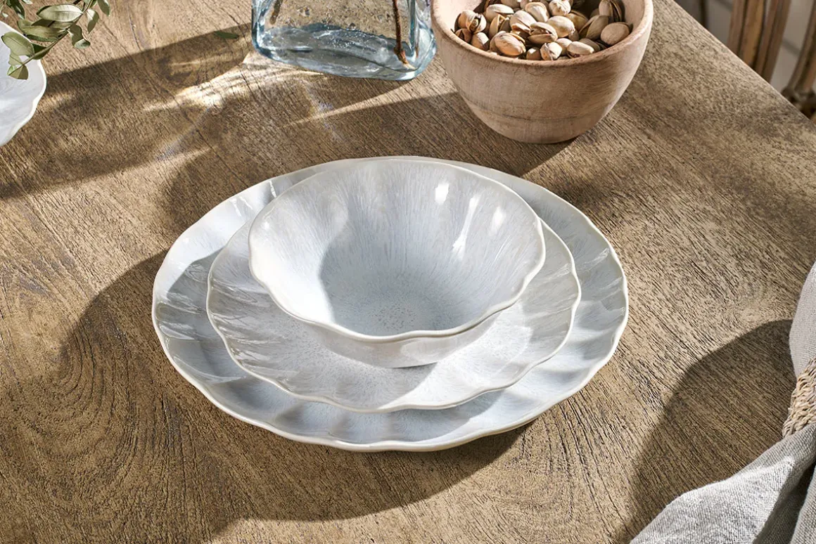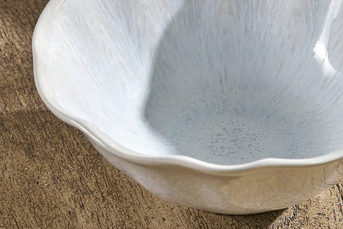 Adding a refined and elegant touch to a table setting, the Aruvi Bowl stands apart from other stoneware pieces thanks to its fluted form, that is pressed and then hand-finished, creating gently scalloped edges that give it it’s tactile charm. The creamy, white reactive glaze develops a very subtle and delicate patina in the kiln that makes each piece unique.