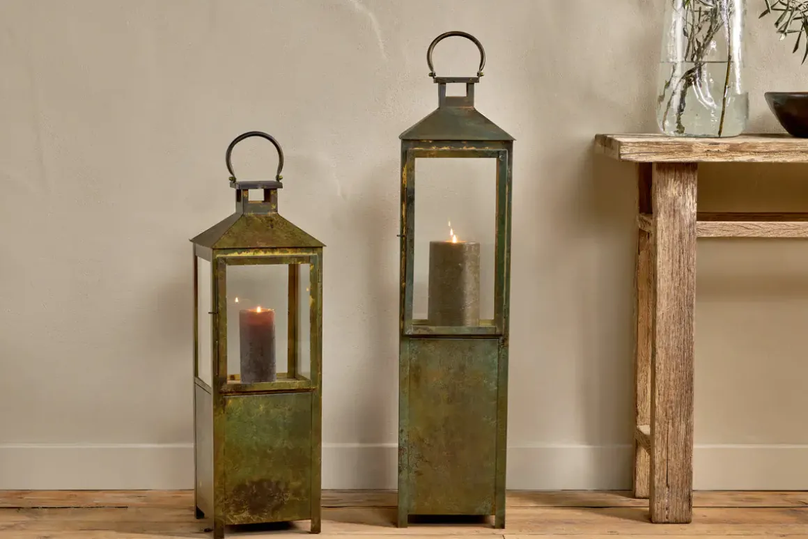 Our large Asharu Lantern is a striking statement piece. It has a traditional look and feel and real room presence with elegantly tall proportions and a gorgeous aged patina finish that brings texture and interest to a living space. The authentic design adds the perfect finishing touch to a room, lifting a space with its standout silhouette. Perfect displayed in a hallway or in a living space, or looking resplendent as a pair on either side of a fireplace or entrance. Use singly, with the smaller Asharu Lantern or as a pair for striking effect. Pair with our rustic pillar candles.